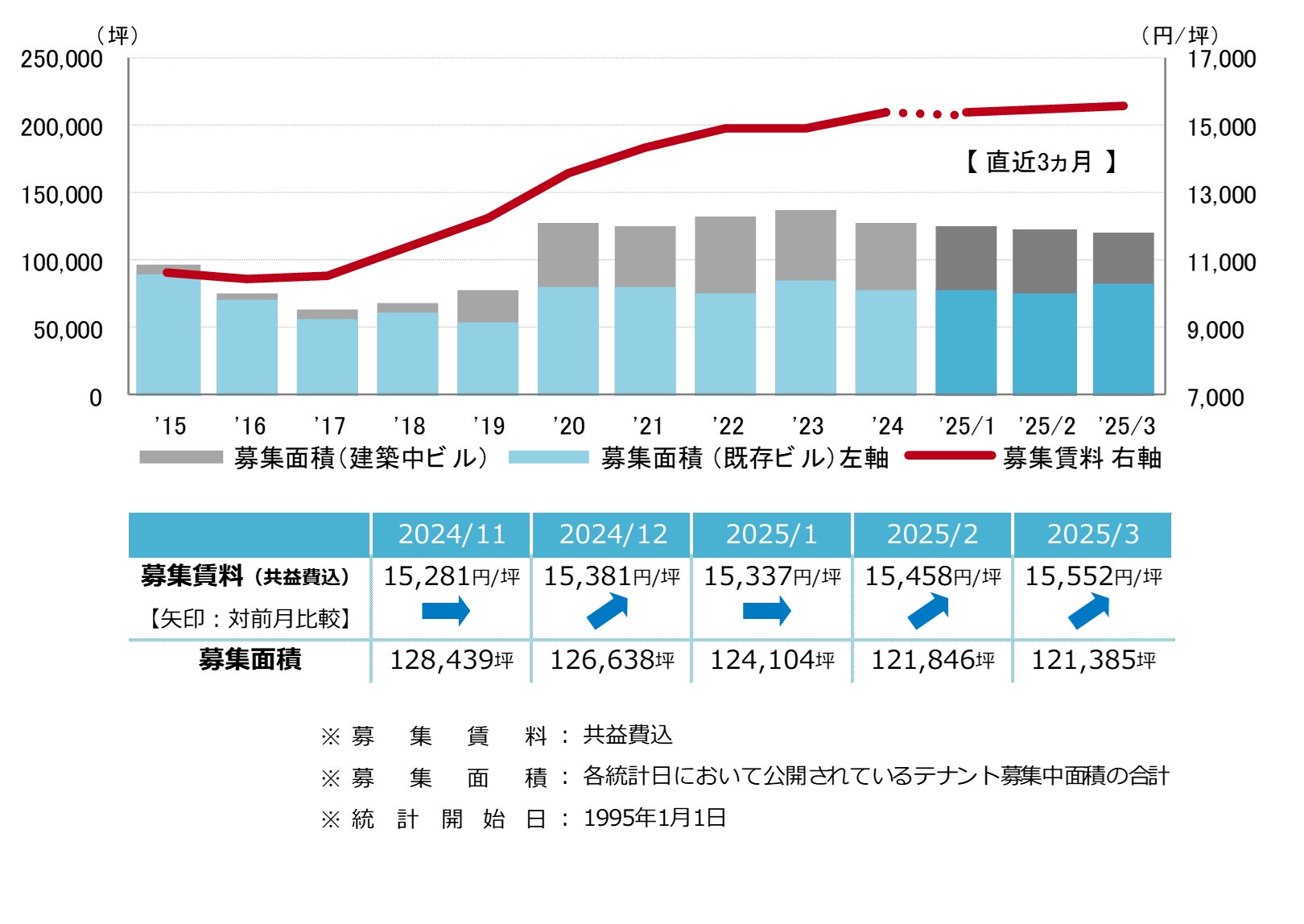 募集賃料は前月比プラス94円/坪の15,552円/坪となった。2ヵ月連続で上昇し、2000年以降の最高値更新が続いている。