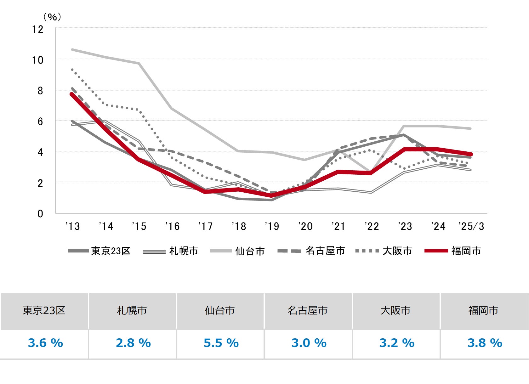 <福岡市 全規模ビル 主要エリア 空室率>