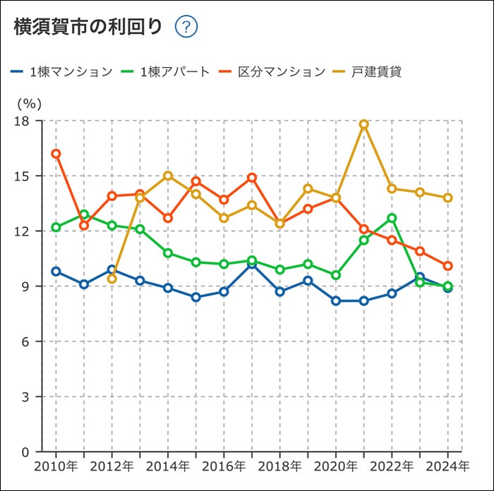 ・物件種別ごとの2010年から現在までの平均利回りの推移を折れ線グラフで確認可能
