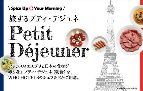 WHGホテルズでは 「早起きしたくなる、朝ごはん。」をコンセプトに、季節や地域に合わせて手作りにこだわった常時40メニュー以上の朝食ビュッフェをご提供し、ご好評いただいております。この「WHGホテルズの朝食で一日をスパイスアップ(=活気づける)してもらいたい」という想いから、シーズナルの朝食フェア「Spice Up Your Morning」をスタート。第1弾となる“朝カレー”(本年6月開催中)に続く第2弾として、今夏の世界大会開催国である“フランス”をテーマにした朝食フェア「旅するプティ・デジュネ」を開催します。日本と共通点の多いフランスの地に想いを馳せながら、まるで旅をするかのように本場のプティ・デジュネをご堪能いただき、活力ある一日をお過ごしください。