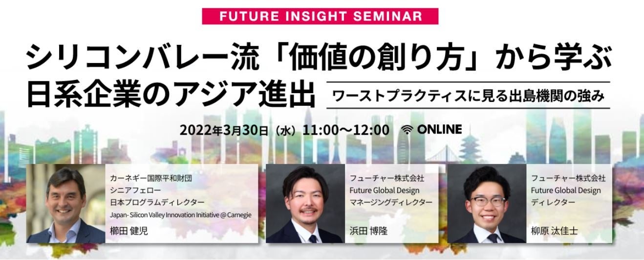 また、3月30日にはFuture Global Designのメンバーが登壇するセミナーを開催します。ゲストスピーカーにカーネギー国際平和財団 シニアフェロー、日本プログラムディレクター 櫛田健児氏をお招きし、「シリコンバレー流『価値の創り方』から学ぶ日系企業のアジア進出~ワーストプラクティスに見る出島機関の強み」と題し、多くのイノベーションを生み出してきたシリコンバレーから海外展開する前に検討すべきポイントを学ぶとともに、事例をもとに進出後に継続的な成長を支えるためのエッセンスを紹介します。