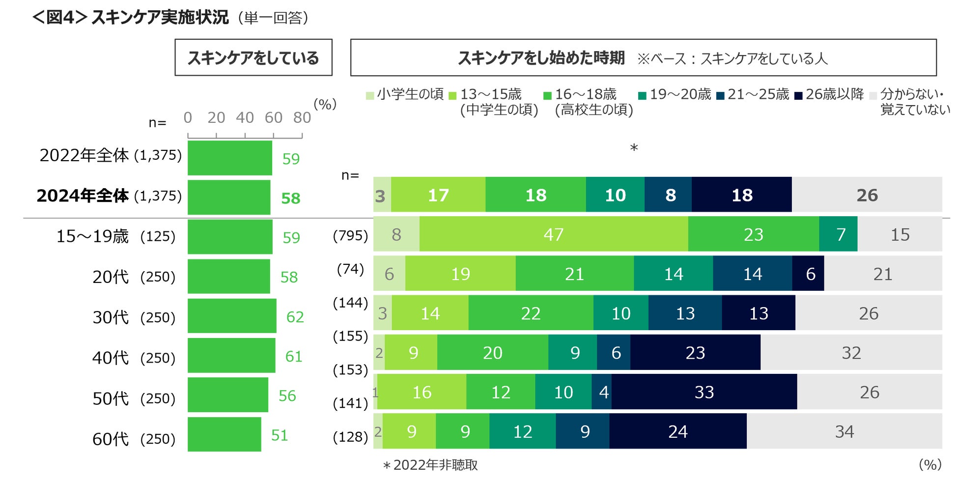スキンケアの実施率は58%と、30~40代を中心に各年代で実施されている。スキンケアをし始めた時期は、15~19歳の「小学生の頃」が8%、「中学生の頃」は47%と半数近く、合わせて55%は中学生までにスキンケアを開始していた。スキンケアを始めたきっかけは、「肌トラブルの改善」が42%と断トツ、特に15~19歳は57%と高く、思春期にニキビができ始める頃からスキンケアを始めることが、もはや若年層では当たり前となっていると言える。<図4>