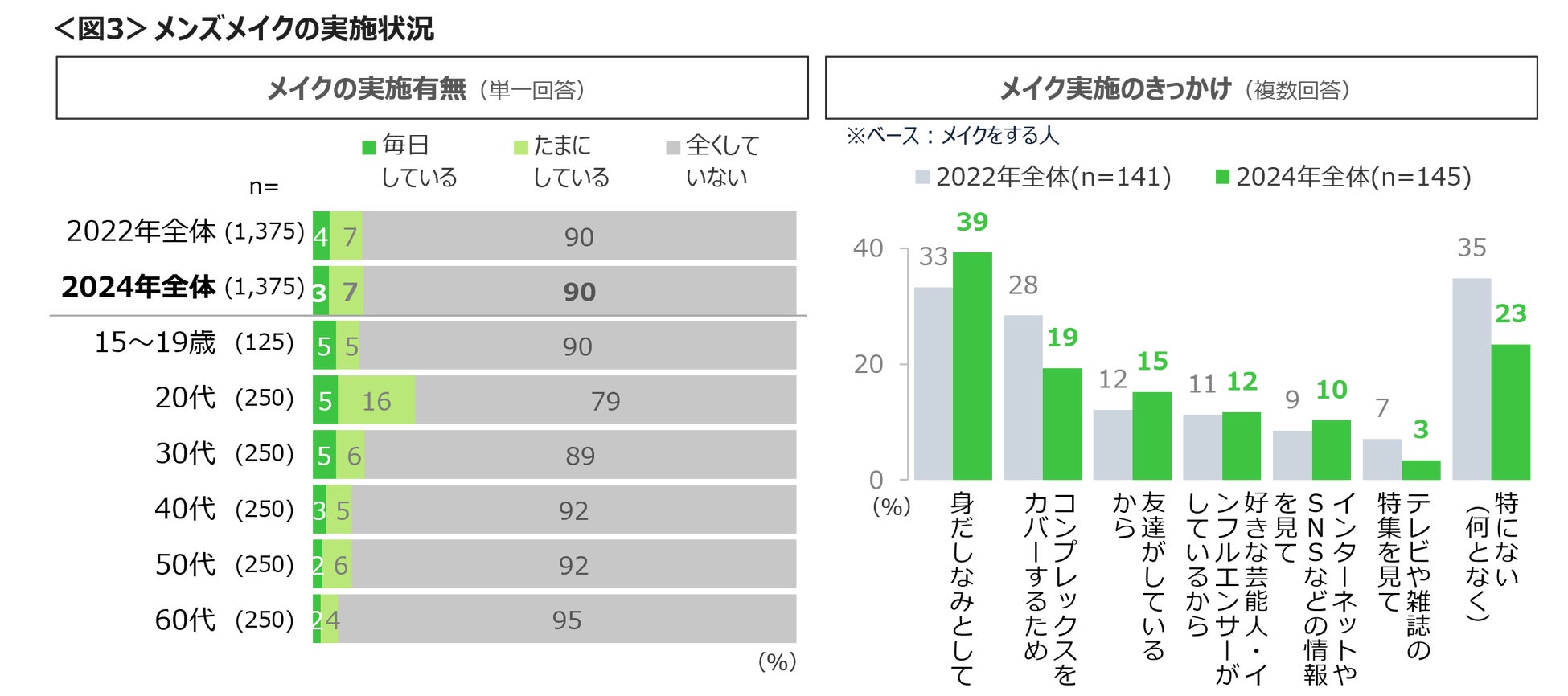 メンズメイク実施者は1割と2022年と同様な結果にとどまっている。20代の「たまにメイクをしている」は16%と目立つ。メイク実施のきっかけは、「身だしなみとして」が39%、「特にない(なんとなく)」23%、「コンプレックスをカバーするため」19%であり、特に「身だしなみとして」が2年前より6pt増加した。<図3>