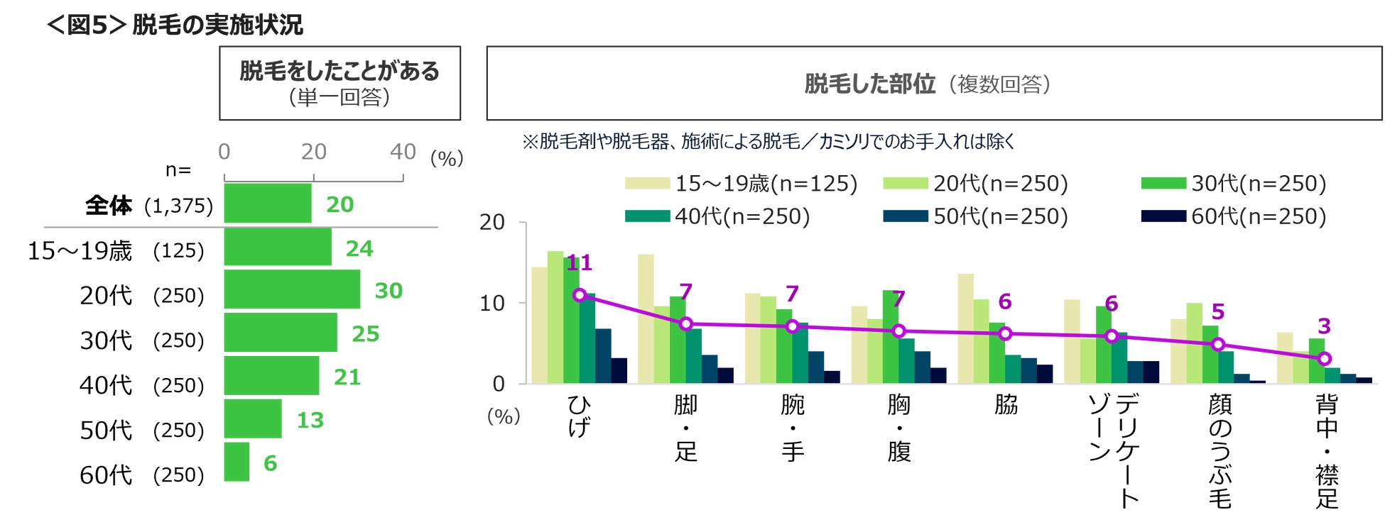 脱毛経験者は20%であり、20代は30%と高い。脱毛部位は15~39歳をメインとした「ひげ」が多い。<図5>