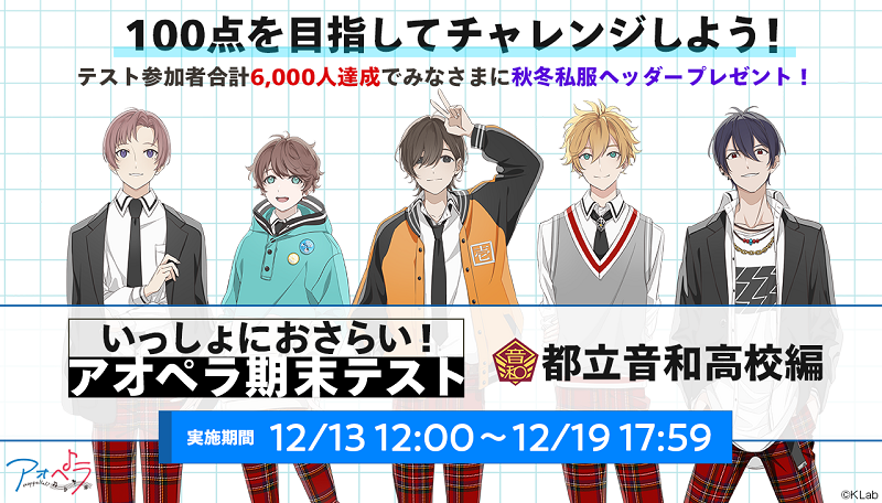 また、参加特典として、テスト参加者が都立、私立で合計6,000人を達成すると、皆さまに『アオペラ』の生徒たちの秋冬私服のヘッダーをプレゼントします。