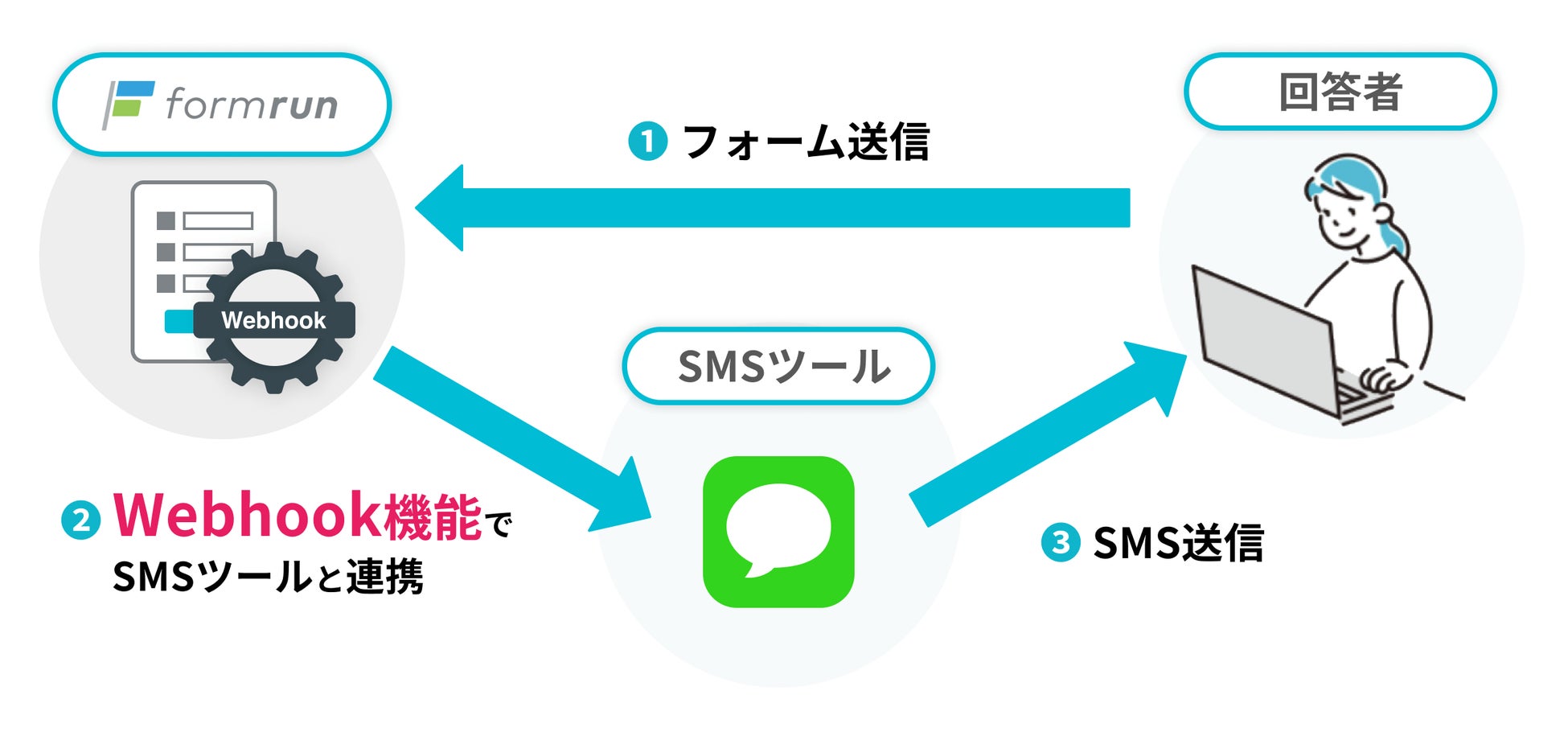 Webhook機能でフォームに回答がされたタイミングでSMSツールにデータ送信するよう設定。フォームの回答直後、SMSから回答者に対して回答内容・その後の案内を送信できるように。