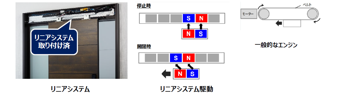 自動開閉には磁力で駆動するリニアシステムを採用しました。磁石とコイルの非接触で駆動するのでモーターのエンジン音などもなく、手動スライディングドアと同等の静音性です。加えて、一般的な自動ドアのようにベルトで駆動しないため、摩耗部品が少なく耐久性に優れています。停電時でも手動スライディングドア並みの開閉力で動かすことができ安心してお使いいただけます。また、施工面では枠にリニアシステムを取り付けた状態で出荷することで、通常のドアの施工業者でも簡単に取り付けが出来ます。(別途、電源工事は必要です。)