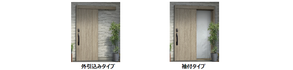 ⽞関ドアとしての利便性においても、省スペースでスムーズに出⼊りできる引⼾タイプを採⽤しました。家の顔として重要なデザイン⾯でも、全22デザイン・全12カラーを揃え、サイズは3タイプ設定しており、充実のラインアップからお選びいただけます。