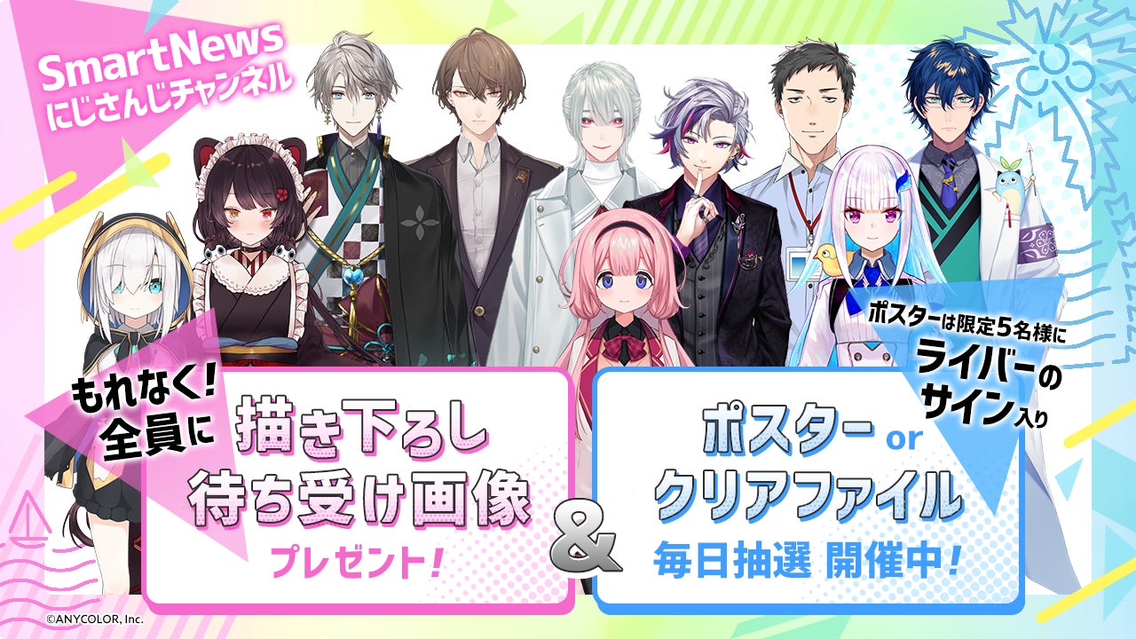 にじさんじチャンネルに所属する10名の人気ライバーがSmartNewsの「にじさんじチャンネル」に週替わりで登場。描き下ろし待ち受け画像をもれなくプレゼント&ポスターorクリアファイルを抽選プレゼント。