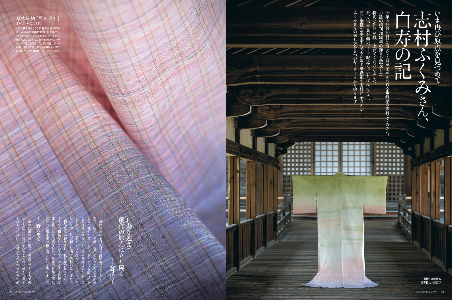 今年めでたく白寿を迎えられる染織家の志村ふくみさん。小誌の創刊70周年の節目を記念した特別な作品を織り上げてくださいました。