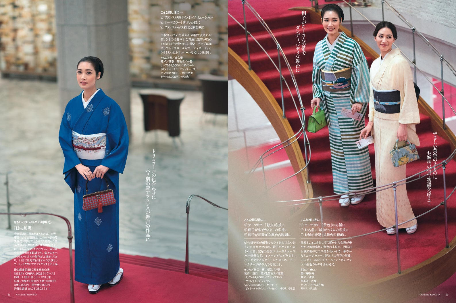 髙木さんは華やかさのある黒、中山さんはドレッシーでつややかな赤、髙地さんは爽やかなターコイズブルーという表紙の着物に加え、特集内では印象の異なる着物をもう1着ずつ着用していただきました。普段はなかなか着ることがないという「きもの」との出会いが引き出す3⼈の魅⼒を10ページにわたってお届けします。
