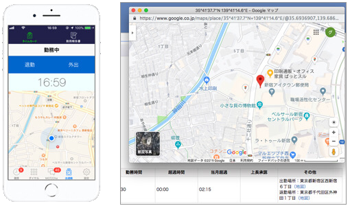 スマホで打刻を行う際、時間とGPS情報を同時に記録。自宅に着いてから退勤打刻を行うなどの不正防止に効果的です。