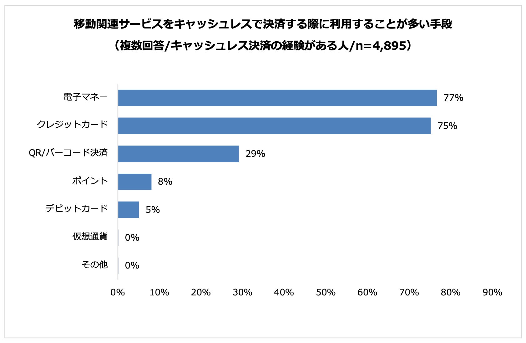 移動関連サービス利用時のキャッシュレス決済手段として最も多いのは、「電子マネー※1」77%でした。2位「クレジットカード」75%、3位「QR/バーコード決済※2」29%となっています。