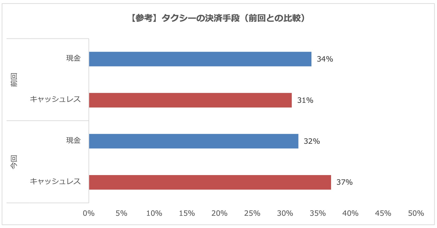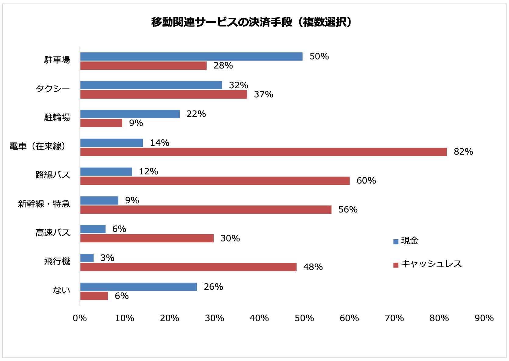 移動関連サービスのうち、キャッシュレス決済よりも現金決済の割合が高かったのは「駐車場」と「駐輪場」のみでした。一方で、キャッシュレス決済の割合が半数を超えたのは「電車(在来線)」82%、「路線バス」60%、「新幹線・特急」56%でした。