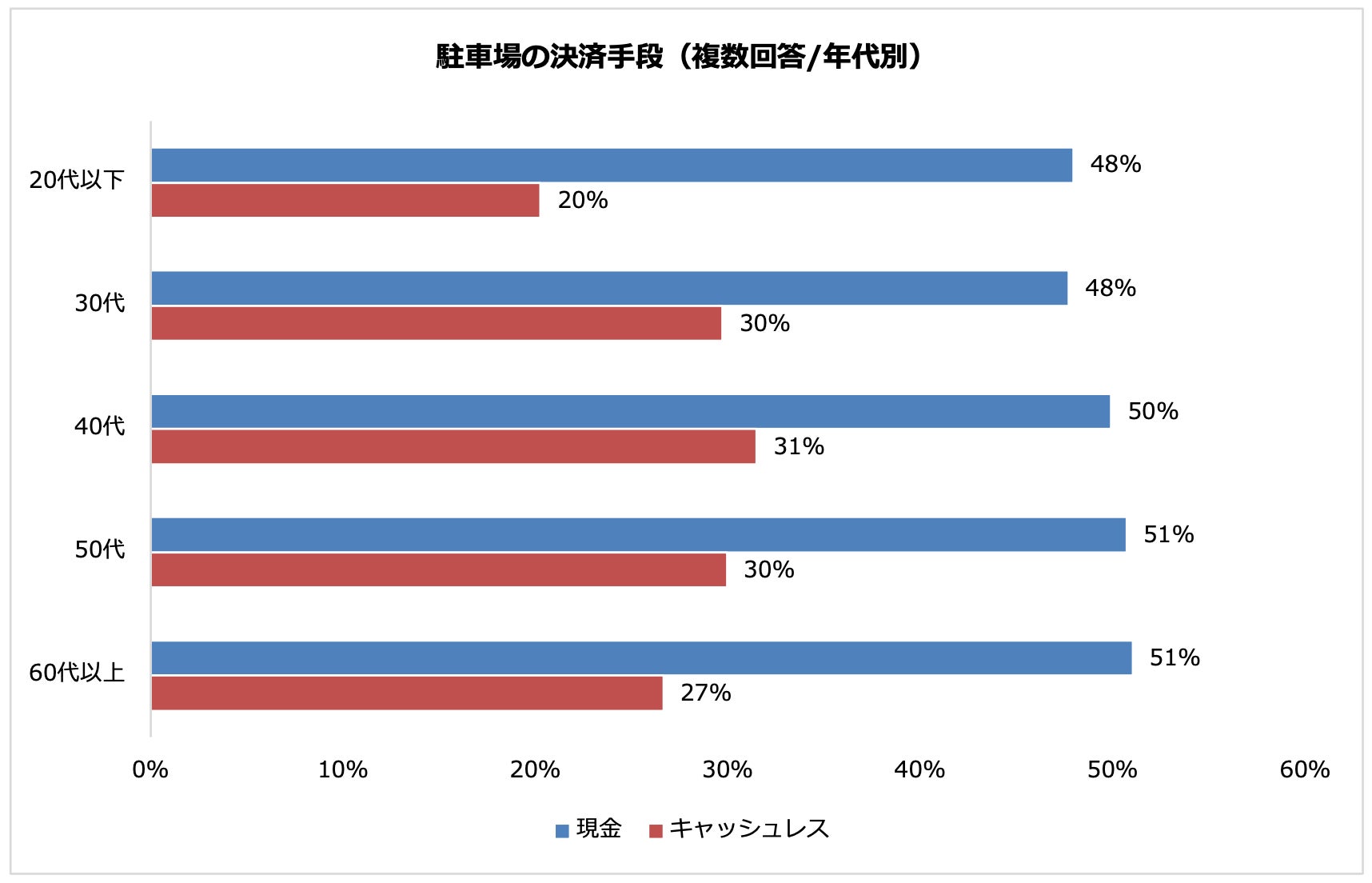 現金決済率が高い「駐車場」で、料金精算時に利用できたら便利だと思う決済手段の1位は「電子マネー」61%、2位は「QR/バーコード決済」と「クレジットカード」が48%で並びました。各決済手段を年代別で見ると、「クレジットカード」は全年代において50%前後とほぼ同じ割合となりましたが、「QR/バーコード決済」は30代が58%、60代以上は32%となるなど、年代による差が見られました。