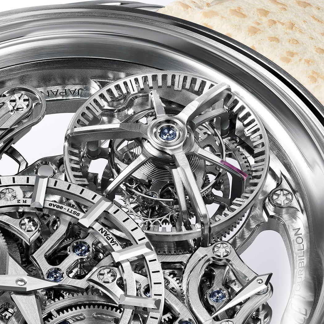 本作に搭載されるキャリバー9ST1は、二つの複雑機構「コンスタントフォース」(※1)と「トゥールビヨン」(※2)を世界で初めて同軸に一体化して組み合わせることで、100を越える部品からなる二つの機構が効率的に機能して、新次元の安定した高精度を生み出します。