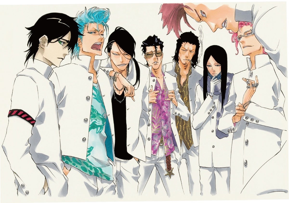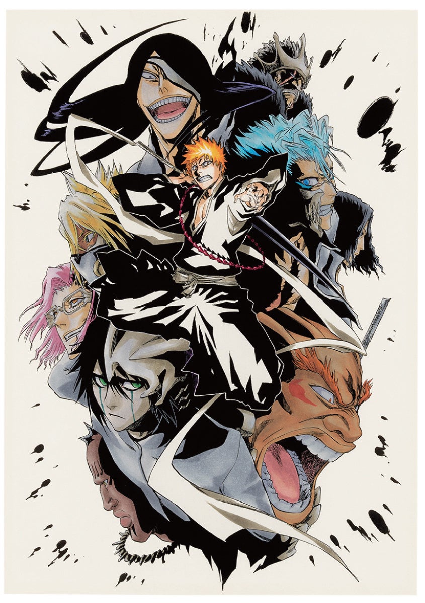 白い詰襟姿で描かれるのは、かつて黒崎一護や護廷十三隊と対峙した面々。揃いの白い衣服には少しの乱れも汚れもない。一護らが黒い詰襟姿で血だらけで描かれているのとは対照的な作品です。