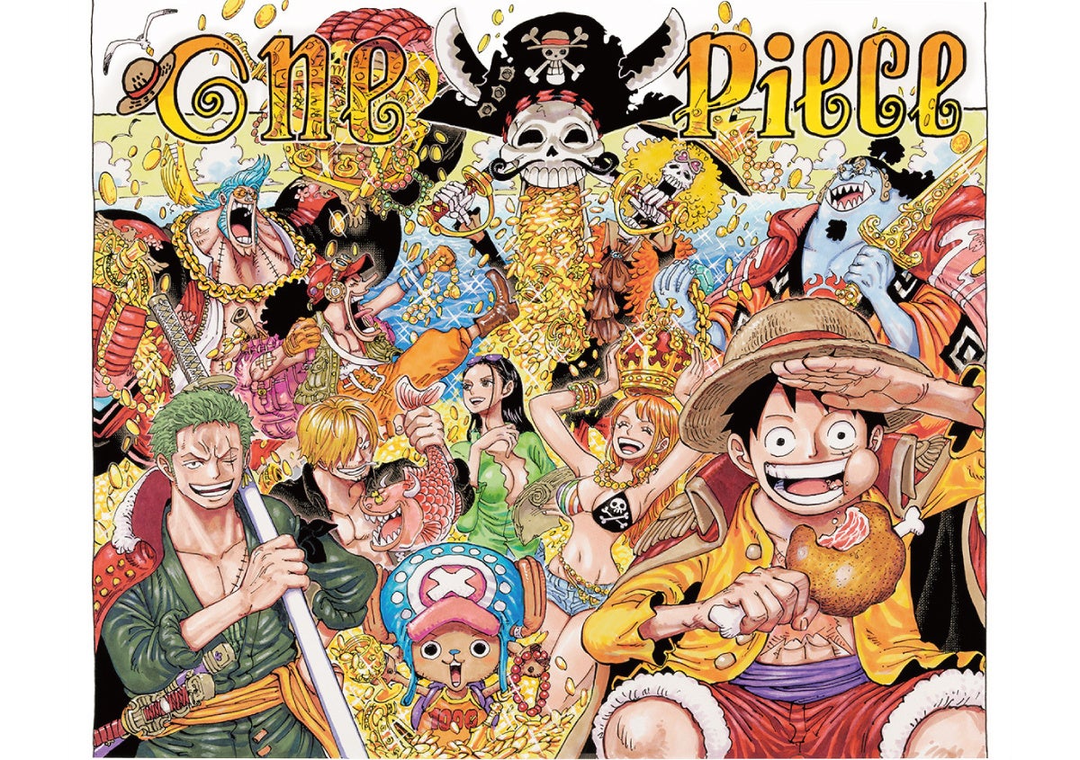 この絵は、連載100話記念の作品のセルフオマージュで、『ONE PIECE』の文字や財宝を吐き出すドクロが同じデザインになっています。まだ初々しくもあった頃に比べたくましく成長しているルフィ、ゾロ、ナミ、ウソップ、サンジの5人に、頼もしい仲間も加入。煌めく財宝にも負けない輝きを放つ、麦わらの一味の笑顔が眩しい作品です。