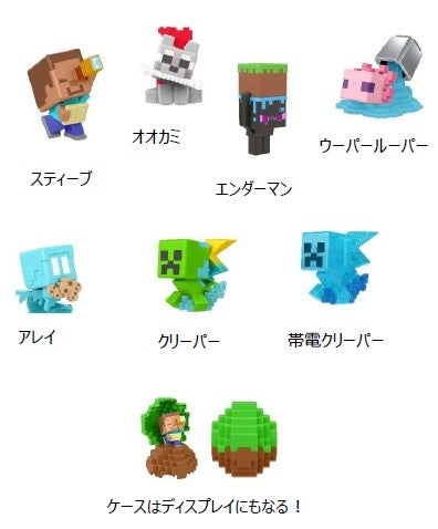 スポーンエッグに入ってさまざまなポーズをした、とってもキュートなミニフィギュアです。全7種類でスペシャルフィギュアに帯電クリーパーもいます。中身がわからないブラインド仕様で、パッケージのスポーンエッグはそのままディスプレイにもすることできます。