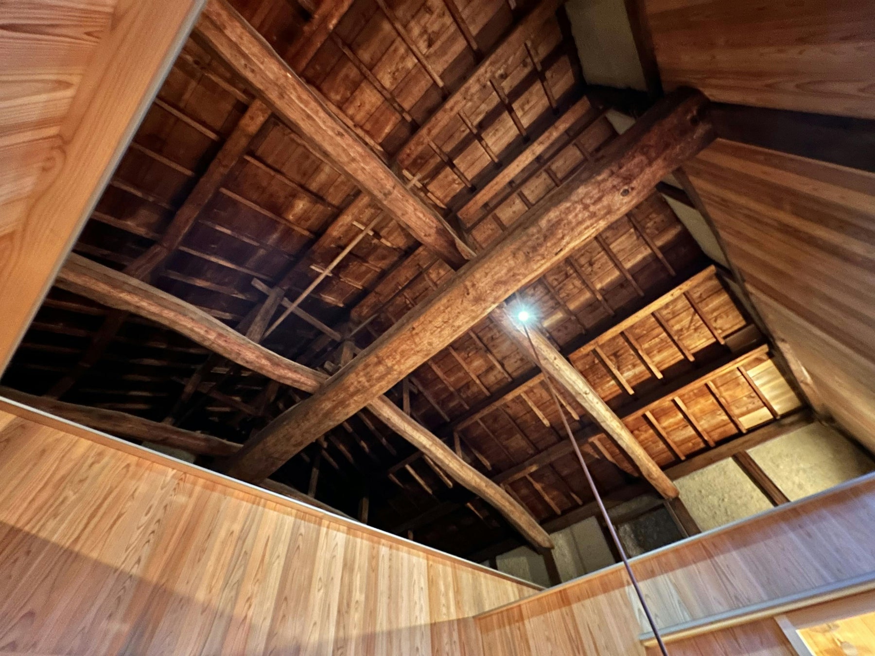 客室の中庭から見上げると、醸造上屋の屋根を支える長さ8mの丸太梁と、それによって内部に柱の無い大空間の迫力を感じることができます。