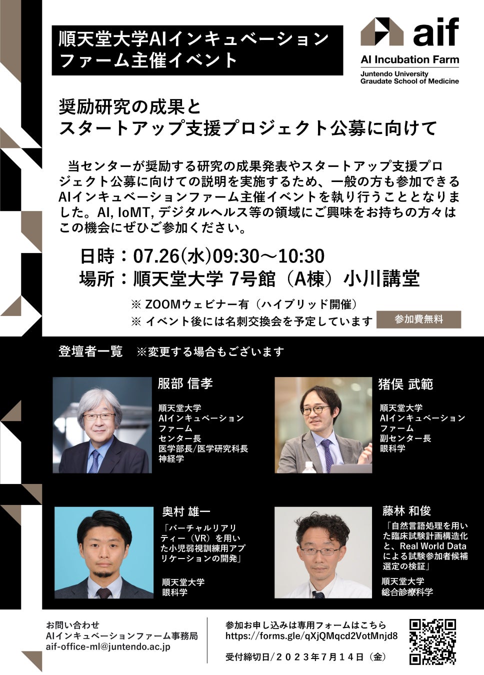 順天堂大学AIインキュベーション ファーム主催イベント奨励研究の成果とスタートアップ支援プロジェクト公募に向けて【2023年7月26日(水) 9:30~10:30】