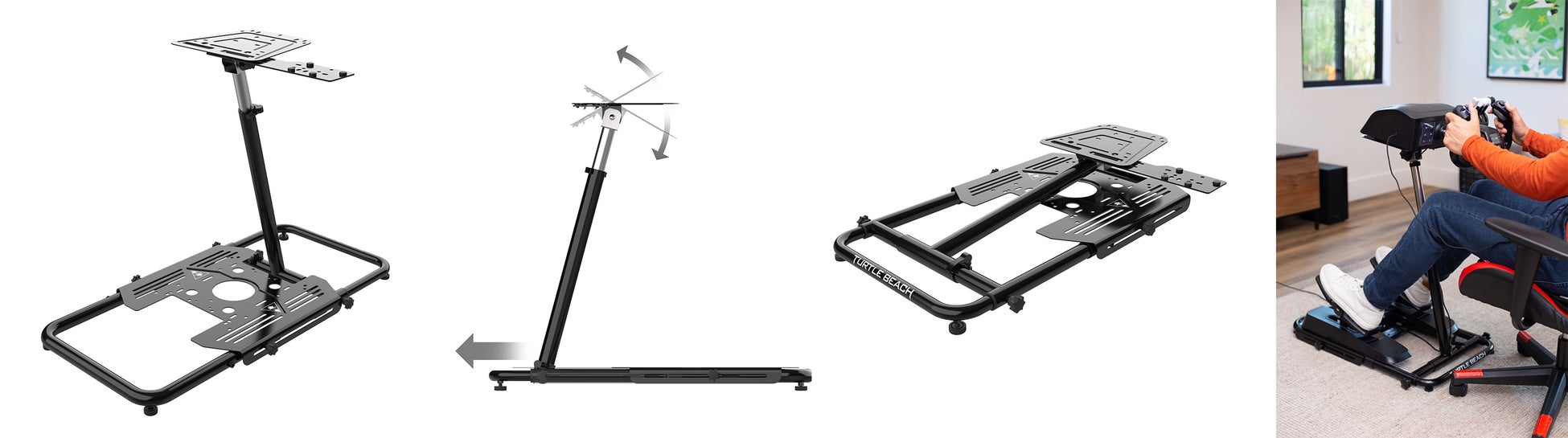 「VelocityOne Stand」は、フライトシミュレーションやレーシングシミュレーション用の周辺機器と組み合わせて使用できるスタントです。Turtle Beachの「VelocityOneフライトユニバーサルコントロールシステム」やラダーペダルの他、互換性のあるサードパーティ製の周辺機器に使用できます。スタンドは、クイックリリースラッチにより、高さ、角度、長さを無段階で調整可能。ヨークやホイールを取り付ける上の設置台と、レーシングペダルやラダーペダルを取り付ける下の設置台は、体格や環境に合わせて傾けることができ、リバーシブル仕様なので、お好みでスタンドの向きを変えられます。ゴム足の長さを調節することで、スタンドをしっかりと固定でき、折りたたみ式なので収納も簡単です。