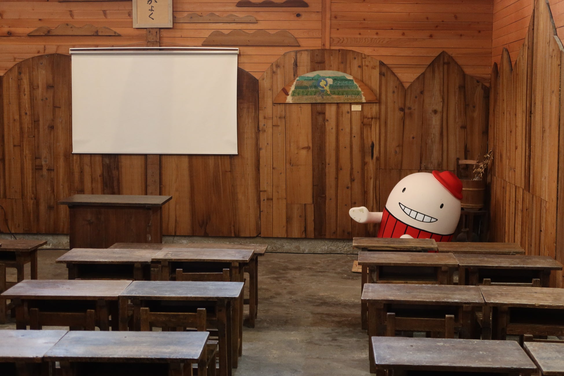 のだみそ株式会社は戦時中の格納庫や旧校舎の校舎を蔵として再利用しており、なぞの旅人フーは味噌蔵見学に訪れた学生などに説明を行う旧校舎の教室にお邪魔しています。