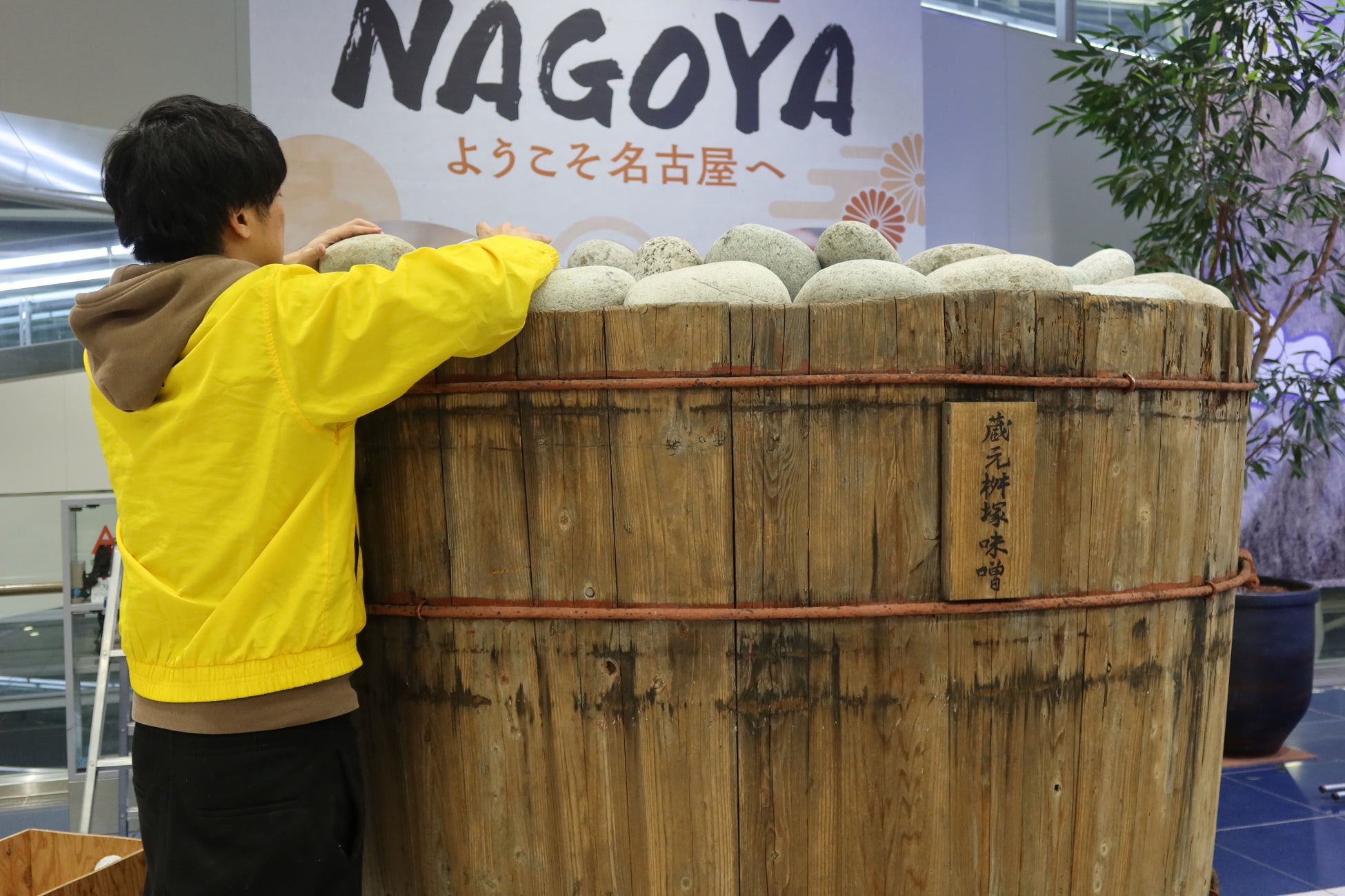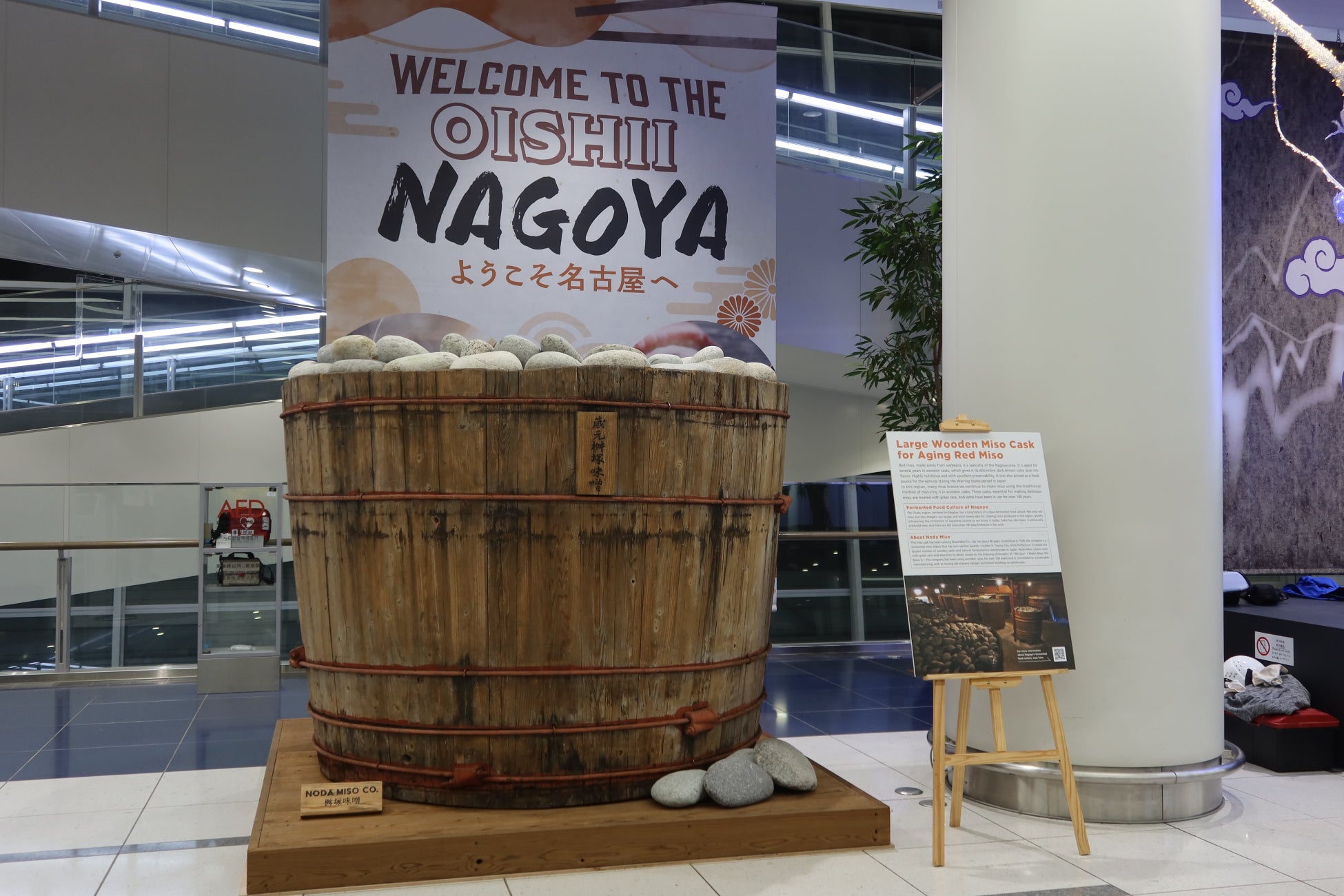 その取り組みの一環として、愛知県を代表する味噌蔵であるのだみそ株式会社(※)のご協力のもと、2月17日(月)に第1ターミナル国際線到着ロビーに味噌桶を設置いたしました。