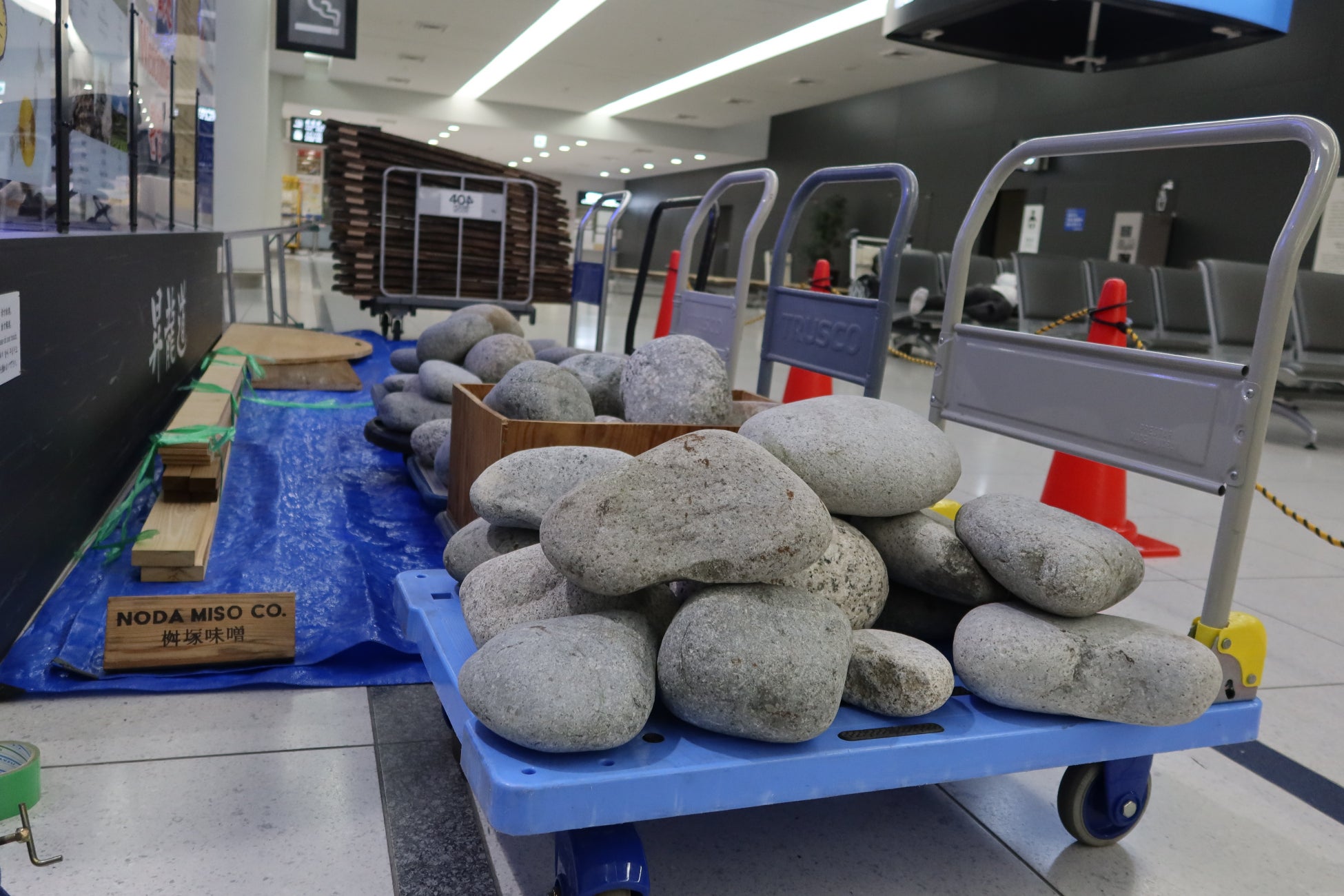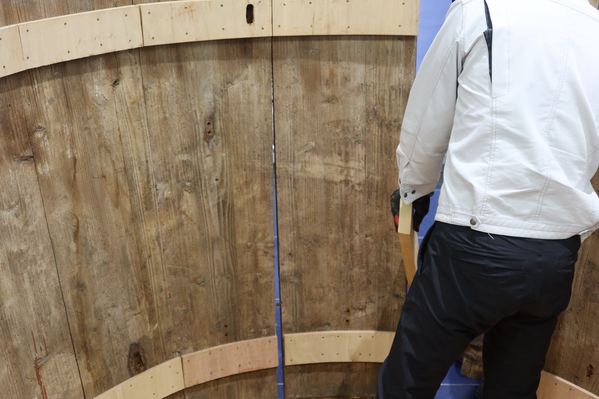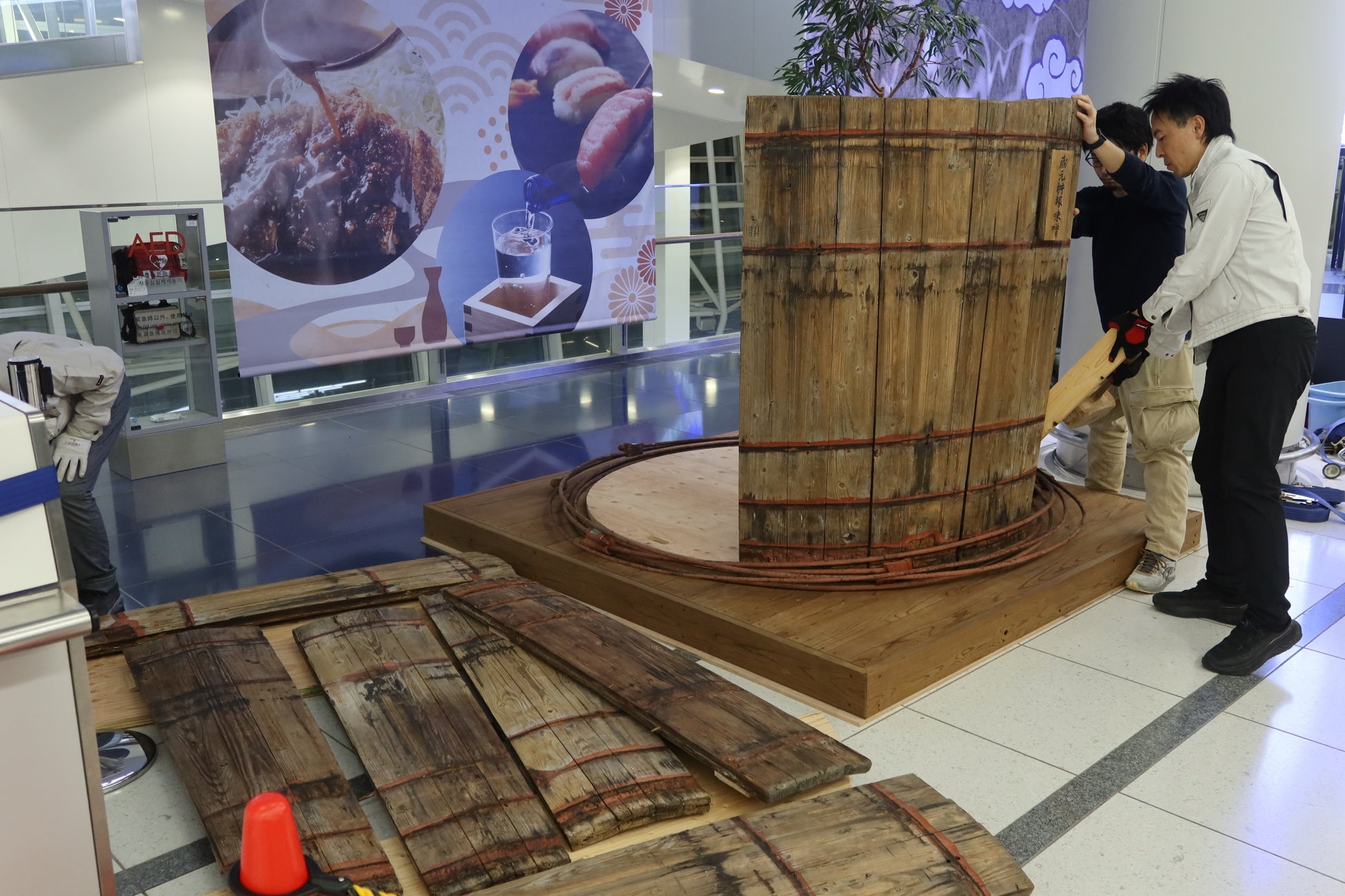 木桶が大きく、ターミナル内にそのまま搬入することができなかったため、木桶を一度解体し、ターミナル内で再度組み立てを行い、設置しました。
