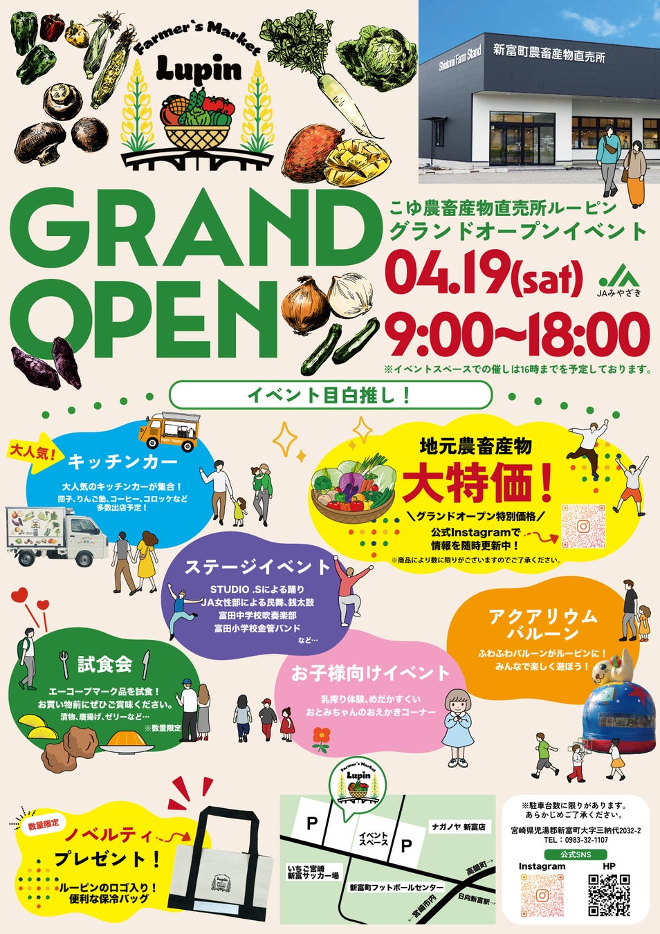 一般財団法人こゆ地域づくり推進機構(宮崎県児湯郡新富町、以下こゆ財団という)は、新富町内の農畜産物直売所「ルーピン」が、2025年4月19日(土)にグランドオープンを迎え、同日9時〜18時に記念イベントが開催されることをお知らせします。新富町公式キャラクター「おとみちゃん」のお絵描きコーナーやクッキー販売等、各種企画や特別価格にて農産物の販売が行われます。詳細は公式サイト(https://ja-lupin-koyu.com/)でご覧いただけます。
