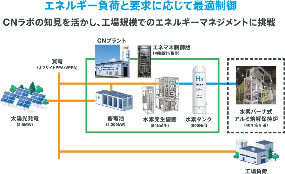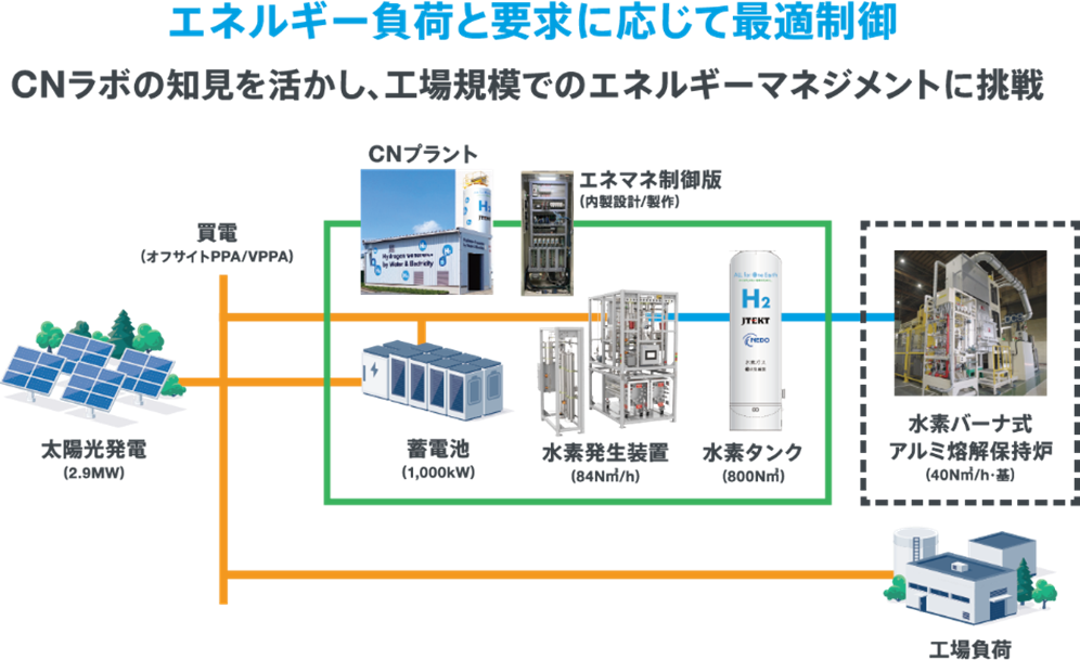 「CN社会実証」は、刈谷CNラボと花園CNモデル工場において「蓄電・水素によるグリーンエネルギーの地産地消」をテーマに、当社が培ってきた設備制御技術で蓄電、水素製造・貯蔵・使用をつないだエネルギーマネジメントシステムによるCNソリューションの開発・実証を進めています。