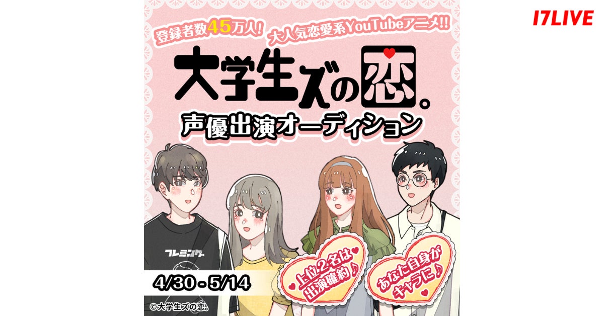 YouTubeを中心に話題沸騰中の短編アニメ作品『大学生ズの恋。』と「17LIVE」が、初めてのコラボレーションイベントとして開催する本オーディションに、ぜひご注目ください。