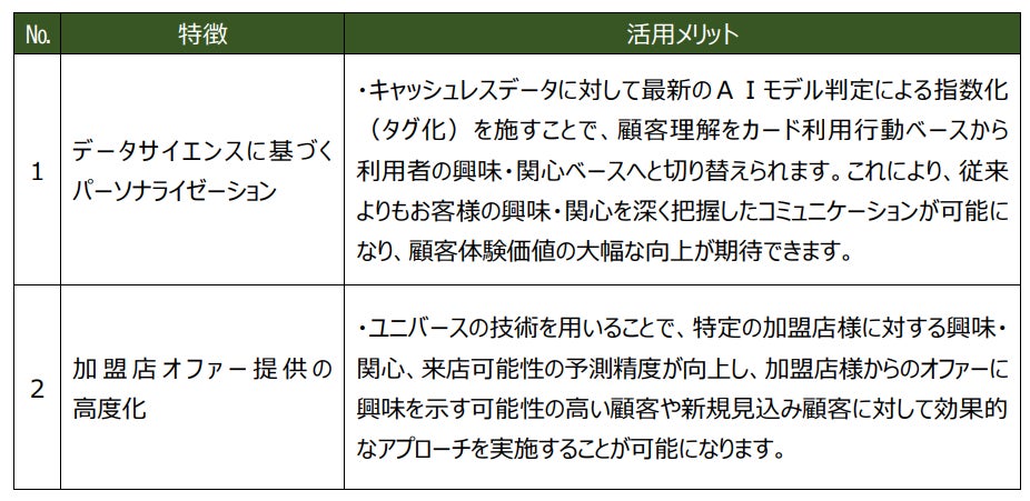 三井住友カードでは、本件契約にあたり、およそ半年の間「ユニバース」を活用した実証実験を行いました。その結果、上記に記載の特徴と活用メリットのパフォーマンスが十分に発揮できることを確認し、今般本格導入を決定いたしました。なお、導入に際しては、日本市場での先行独占利用契約を締結しています。