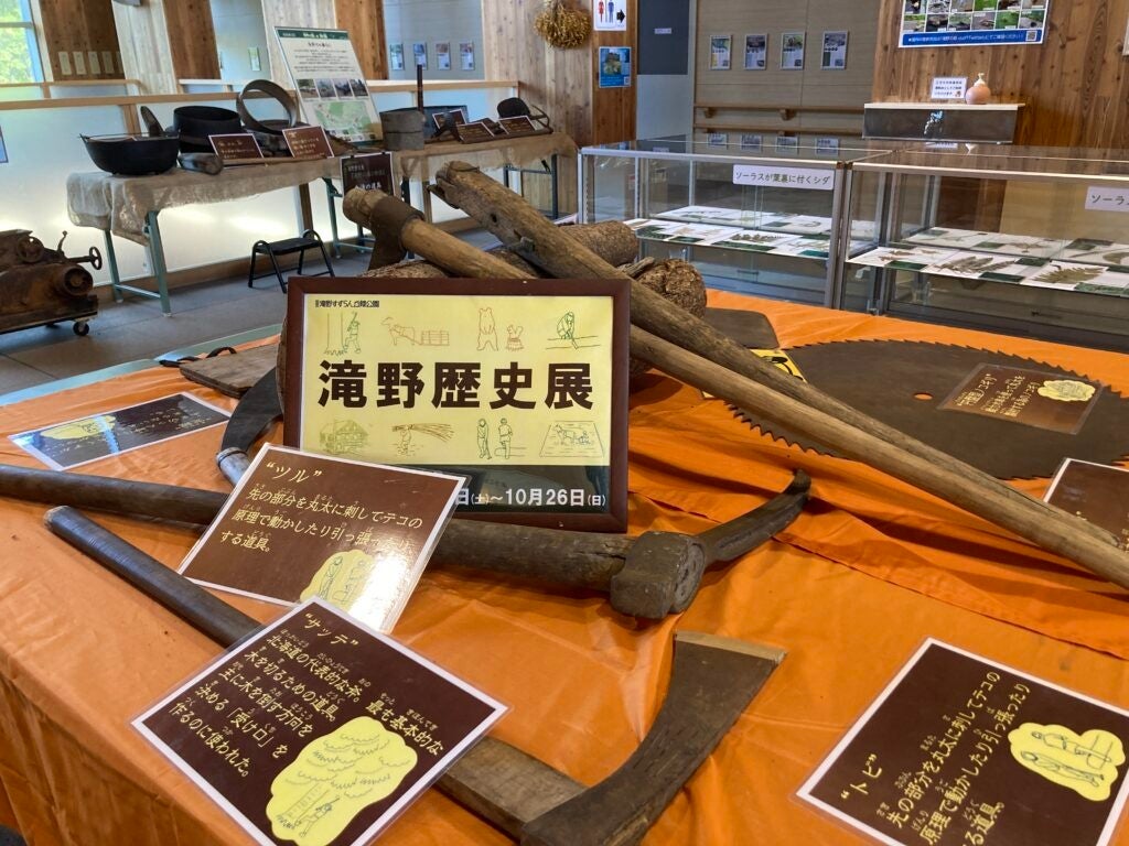滝野歴史展では滝野地区に人が入ってきた歴史をまとめたパネルや、むかし使われていた農機具やノコギリなどの道具類を展示します。
