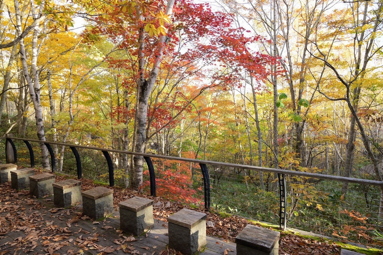 紅葉散策の途中の休憩スポットとしても良し、ただただ何もせずのんびり過ごすも良し。秋の「森のデッキ」で自分時間をお楽しみください。