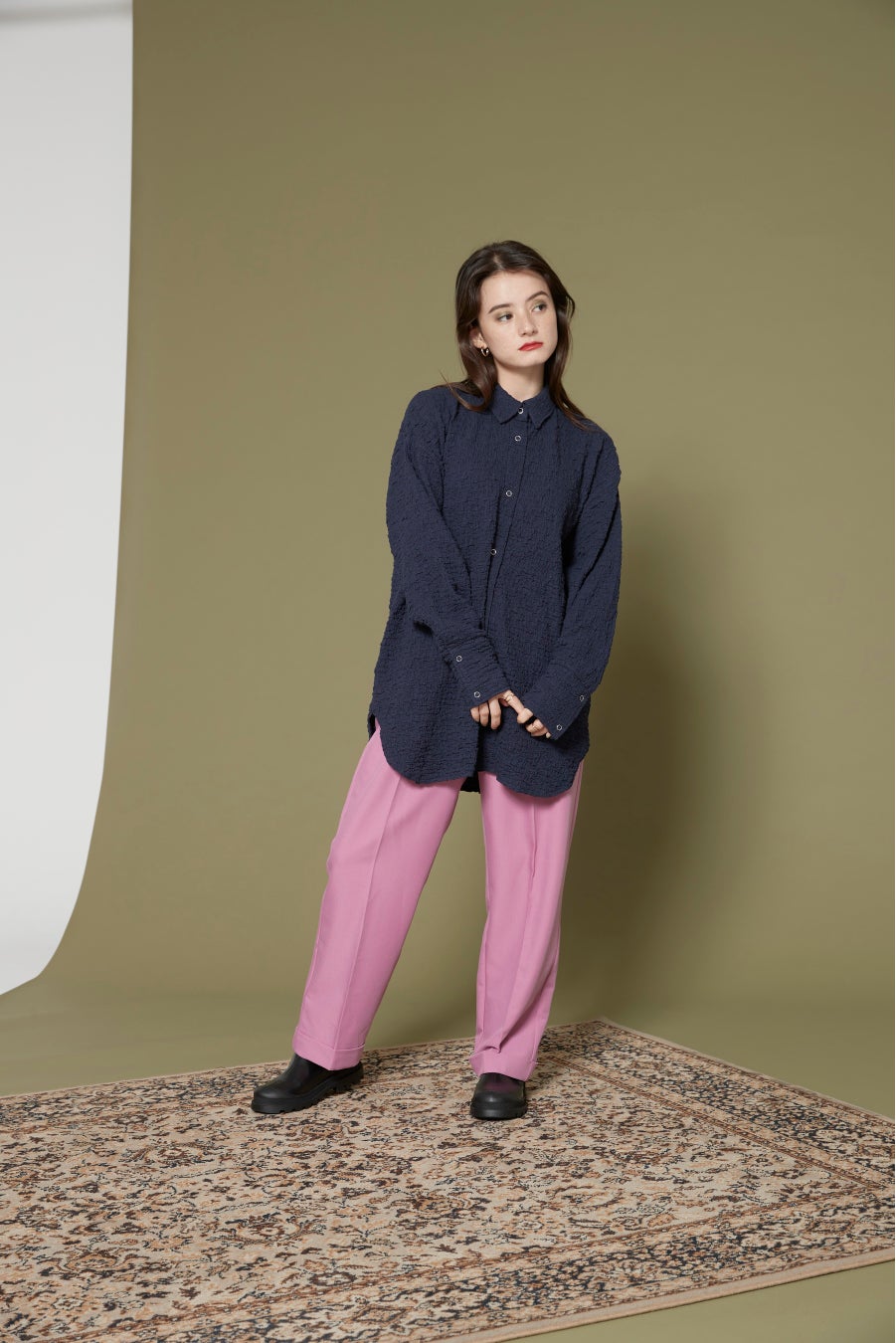 ストレッチ性のあるシャーリング素材を使用したシャツです。シワになりにくく、羽織りとしても最適です。ヒップも隠れる着丈ですので、ゆったりしたBIG シルエットです。ストレスフリーで着用頂けます。