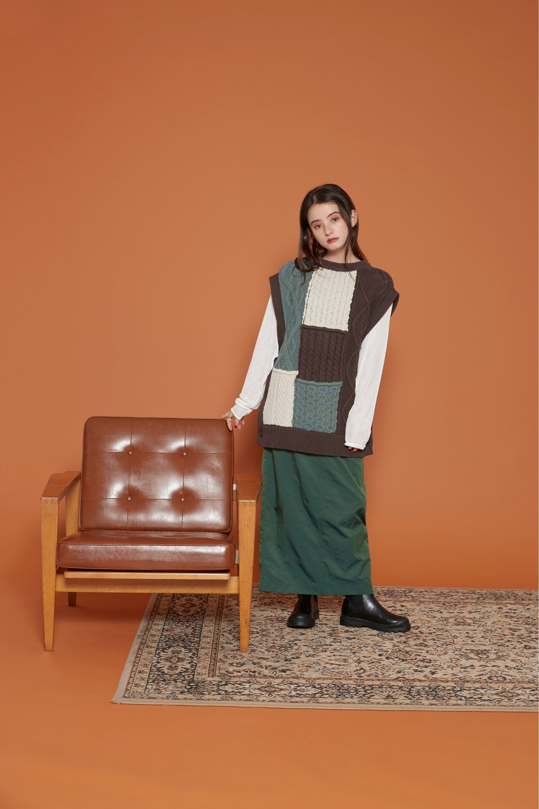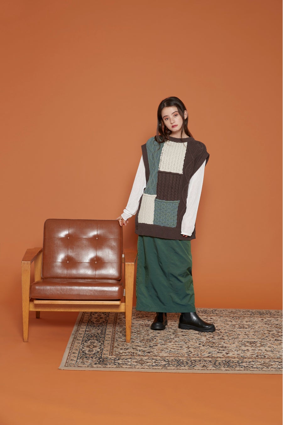 様々な編み地をパッチワークのように繋ぎ合わせたニットベスト。シンプルなロンTやシャツに重ねて秋冬らしい印象に。ショートトップスとの2WAYで着回し可能