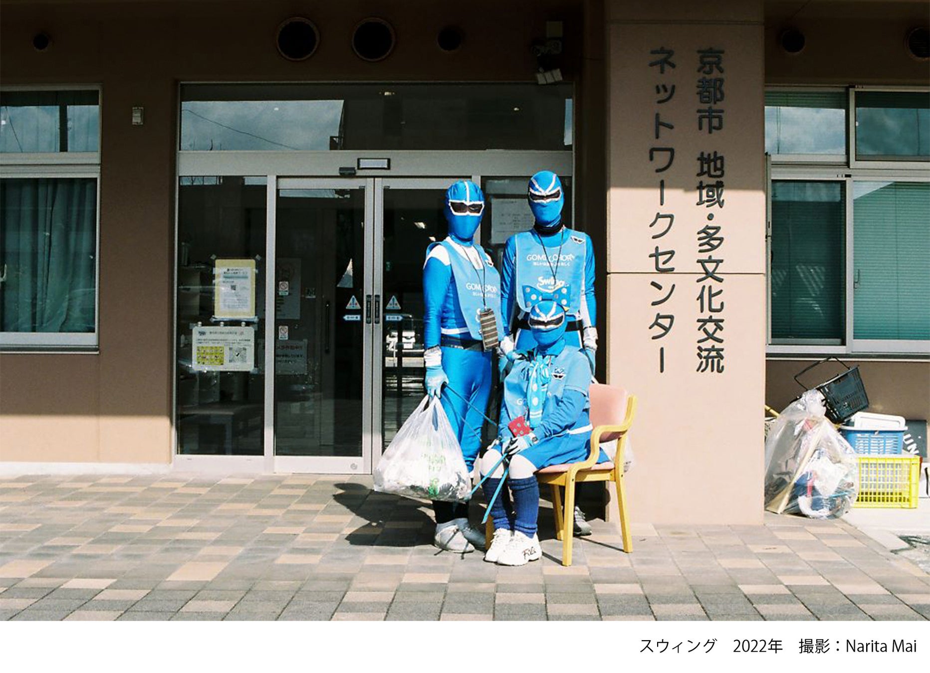 スウィングは2006年より京都にて活動を開始した、障害のある人ない人およそ30名が働く福祉施設。既存の仕事観や芸術観にとらわれない自由な仕事や表現活動を基軸とした事業を行っている。清掃活動「ゴミコロリ」、絵画や詩やコラージュの創作活動「オレたちひょうげん族」のほか、展覧会の実施やフリーペーパーの出版、ラジオ配信など、自主的な発信を伴う活動は多岐にわたる。近年の展示に「Swing×成田舞×片山達貴 展覧会『blue vol.2 ― 捨てられないものが物語ること』」(THEATRE E9 KYOTO[京都]、2022年)などがある。