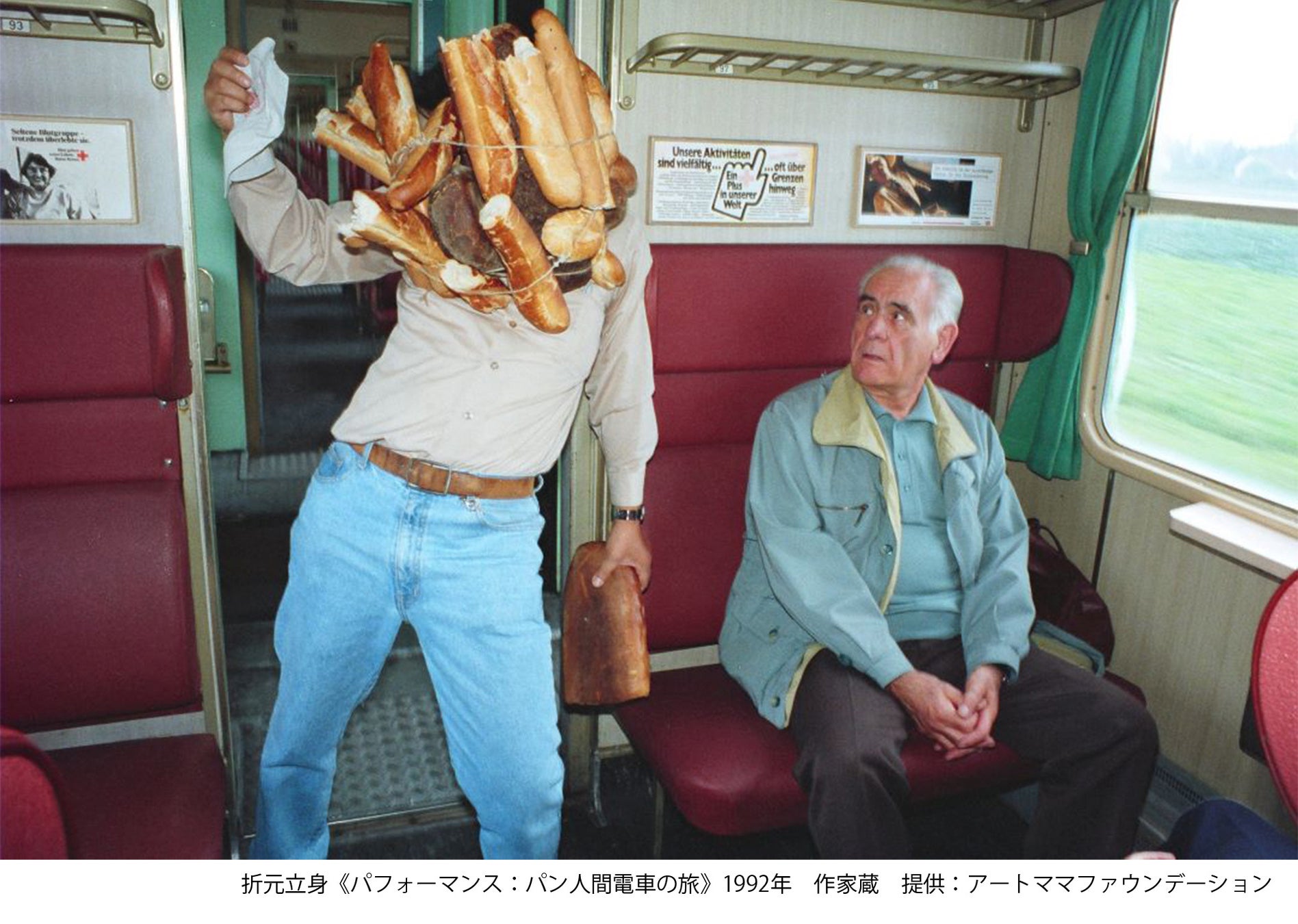 折元立身の代表的なパフォーマンス作品である「パン人間」を実施。