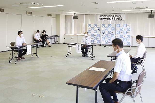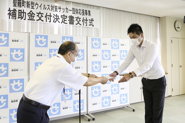 本日22日(水)の午前中、聖籠町役場を会場に行われた「補助金交付決定書交付式」では、聖籠町で活動する3つのスポーツ団体を代表して、アルビレックス新潟レディース山本英明代表取締役社長、JAPANサッカーカレッジ中村勉学校長、アルビレックス新潟からは代表取締役社長是永大輔が出席しました。