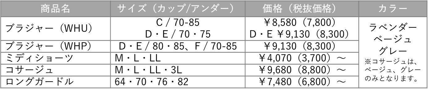 「体型のくずれが気になる」「年齢と共に猫背になってきた」そんな悩みのあるボディを、しなやかな着けごこちで整えるシリーズです。サイズダウンしたバストをサポートし、リフトアップするブラジャー(WHU)と、豊かなバストのボリュームを整えるブラジャー(WHP)をご用意しています。