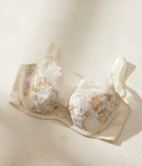 今シーズンは、「洗練・優雅」という花言葉を持つガーデニアの花をモチーフにしたレースで登場。刺しゅうレースは4色の糸使いが華やかなマルチカラーで、1色をラメ糸にしてアクセントにしています。