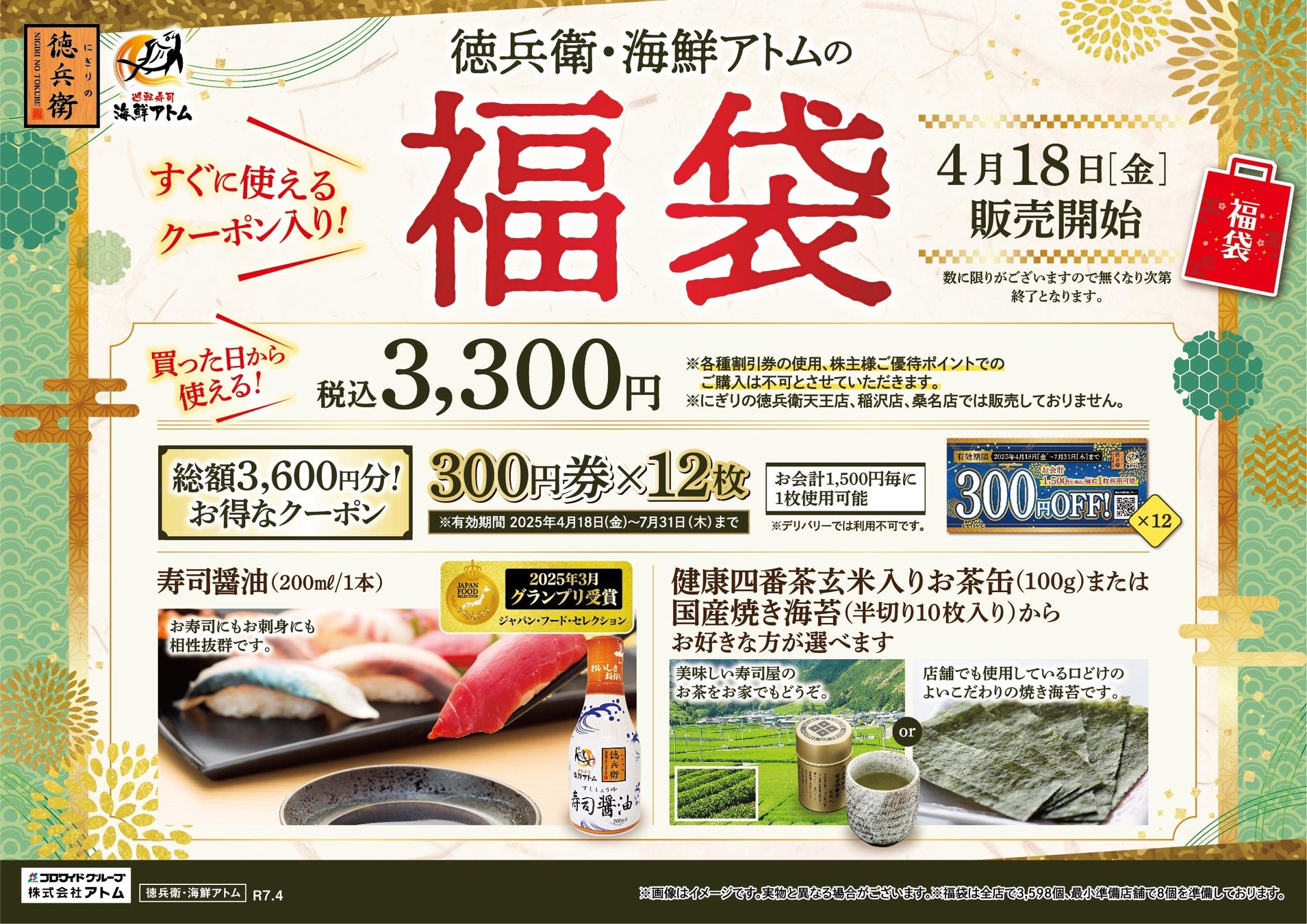 コロワイドグループの株式会社アトム(本社:神奈川県横浜市 代表取締役社長:田中公博)は、回転寿司業態の「にぎりの徳兵衛」「海鮮アトム」の計48店舗で、【徳兵衛・海鮮アトムの福袋】の予約受付を2025年4月1日(火)から開始いたします。