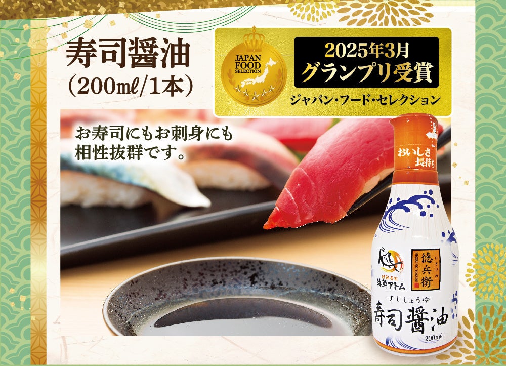 ②寿司醤油(200㎖)※ジャパン・フード・セレクションでグランプリ受賞したオリジナル寿司醤油です。