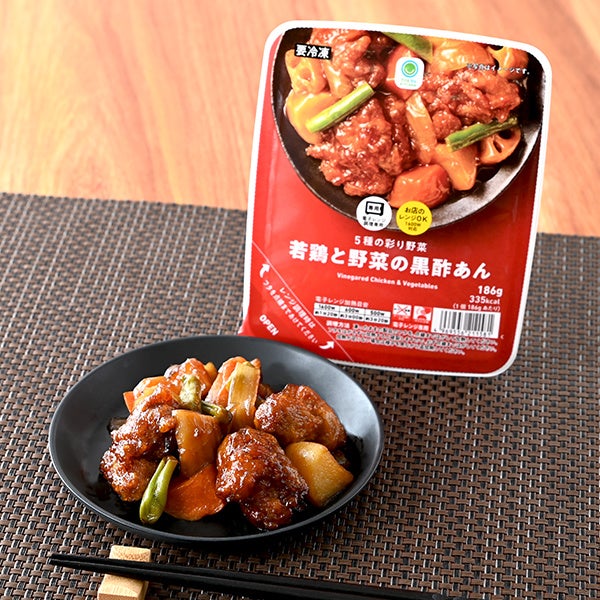 【内容】にんじん・じゃがいも・蓮根・たまねぎ・いんげんの5種類の野菜と鶏肉に、黒酢あんを絡めたメニュー(冷凍食品)です。味の決め手となる「黒酢あん」は、玄米黒酢、リンゴ酢、三温糖、濃口醤油、清酒、本みりんなどの調味料の配合について試行錯誤を重ねることで、甘みと酸味のバランスが絶妙な味わいを実現しました。