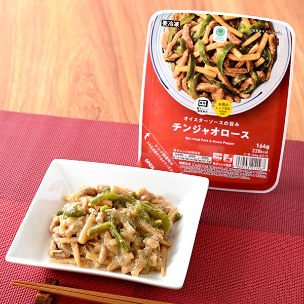 【内容】豚肉、たけのこ、ピーマン、ねぎにタレを加えたチンジャオロース(冷凍食品)です。豚肉は卵と片栗粉を付けてから焼くことで柔らかい食感を実現しました。タレは、オイスターソース、紹興酒、ごま油、濃口醤油などを配合し、旨みをしっかり感じられる味わいに仕上げました。