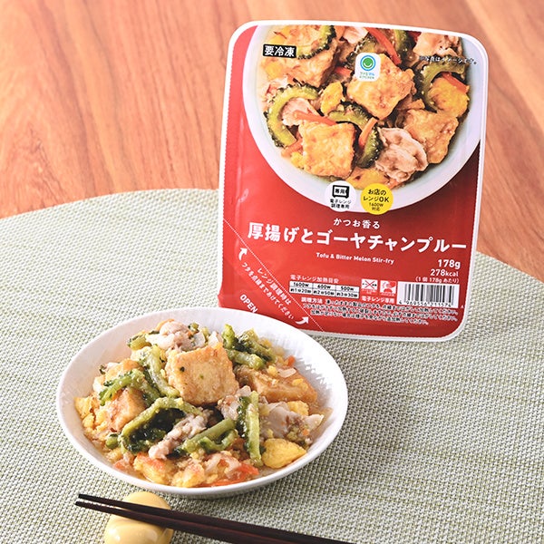 【内容】豚肉、にがうり、たまねぎ、にんじん、玉子を使ったゴーヤチャンプルーに、タレとの絡みが良い厚揚げを盛り付けたメニュー(冷凍食品)です。タレは、本みりん、うす口醤油、清酒、かつお節などを配合したたれで、ゴーヤチャンプルーと厚揚げそれぞれに絡み合っています。