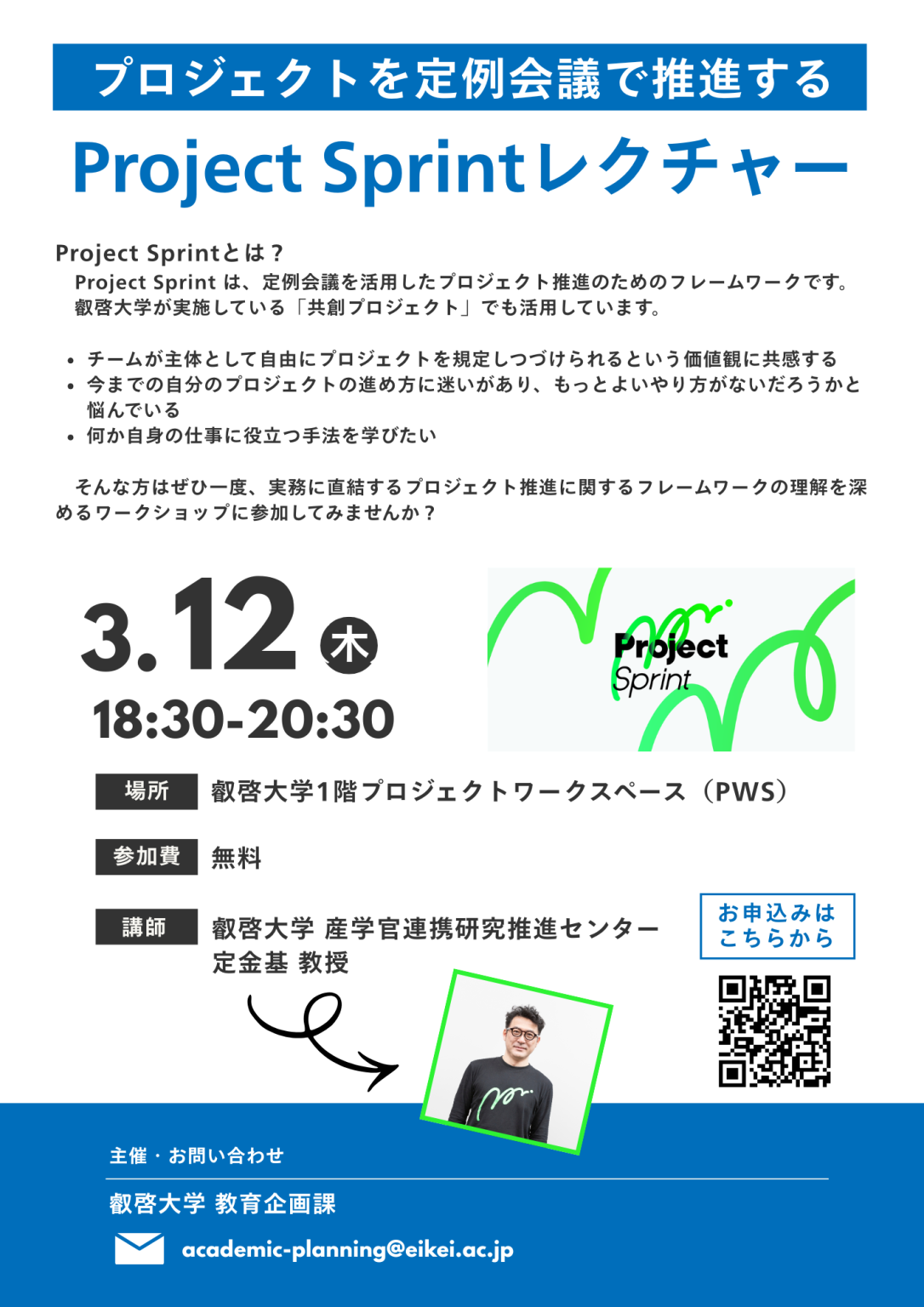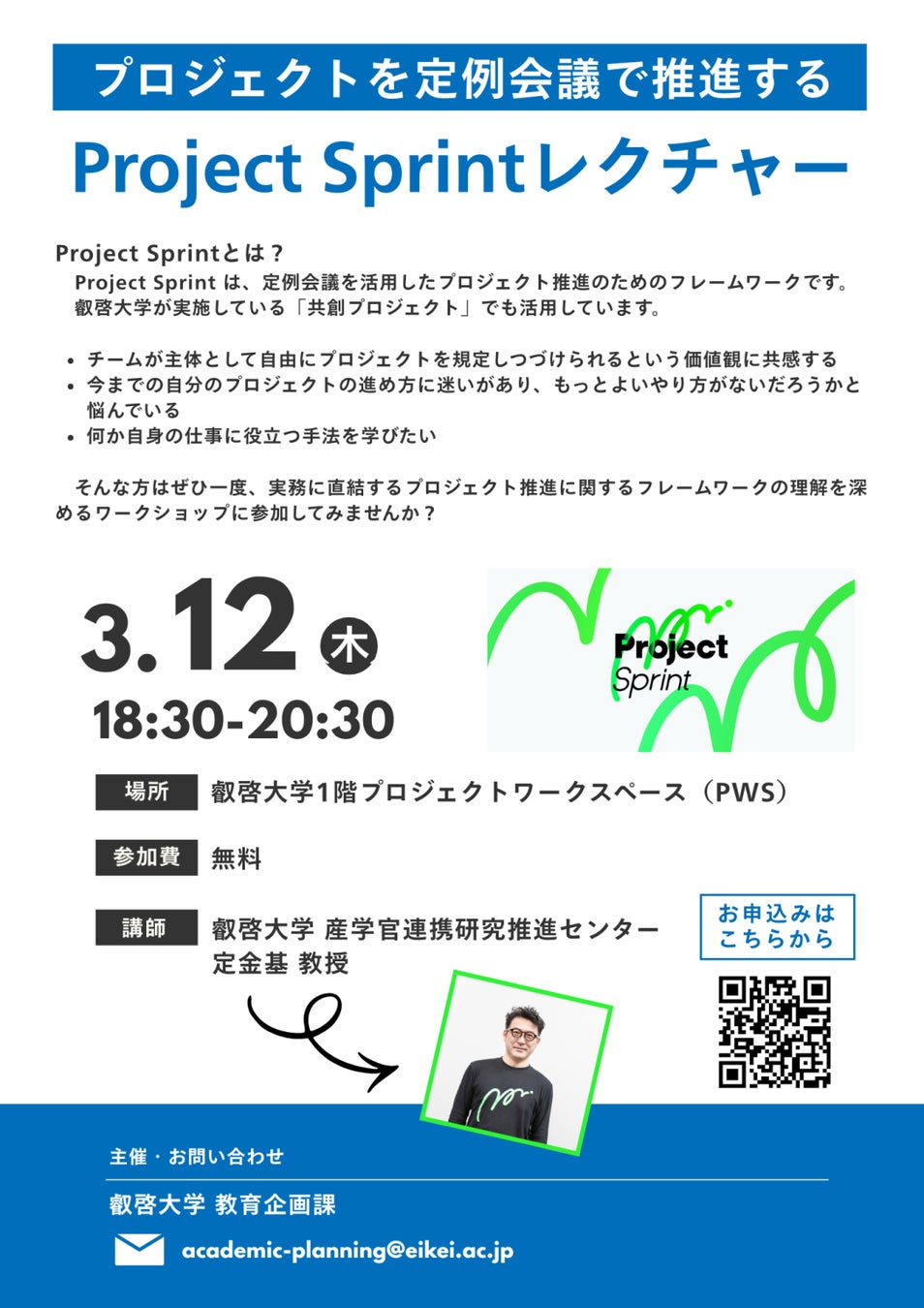 叡啓大学(学長 有信睦弘、広島市中区)は、2026年3月12日(木)、叡啓大学のプロジェクトワークスペースにて、「プロジェクトを定例会議で推進するProject Sprintレクチャー」を開催します。