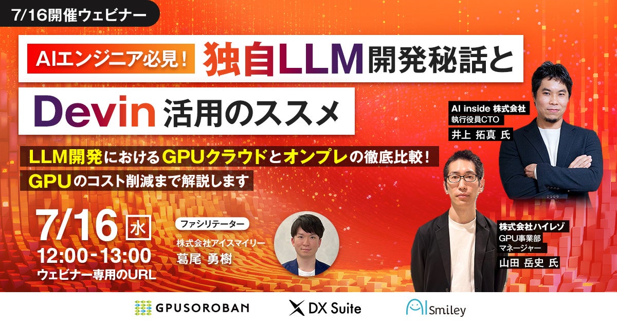 【7/16開催ウェビナー】AIエンジニア必見!独自LLM開発秘話とDevin活用のススメ ~LLM開発におけるGPUクラウドとオンプレの徹底比較!GPUのコスト削減まで解説します~