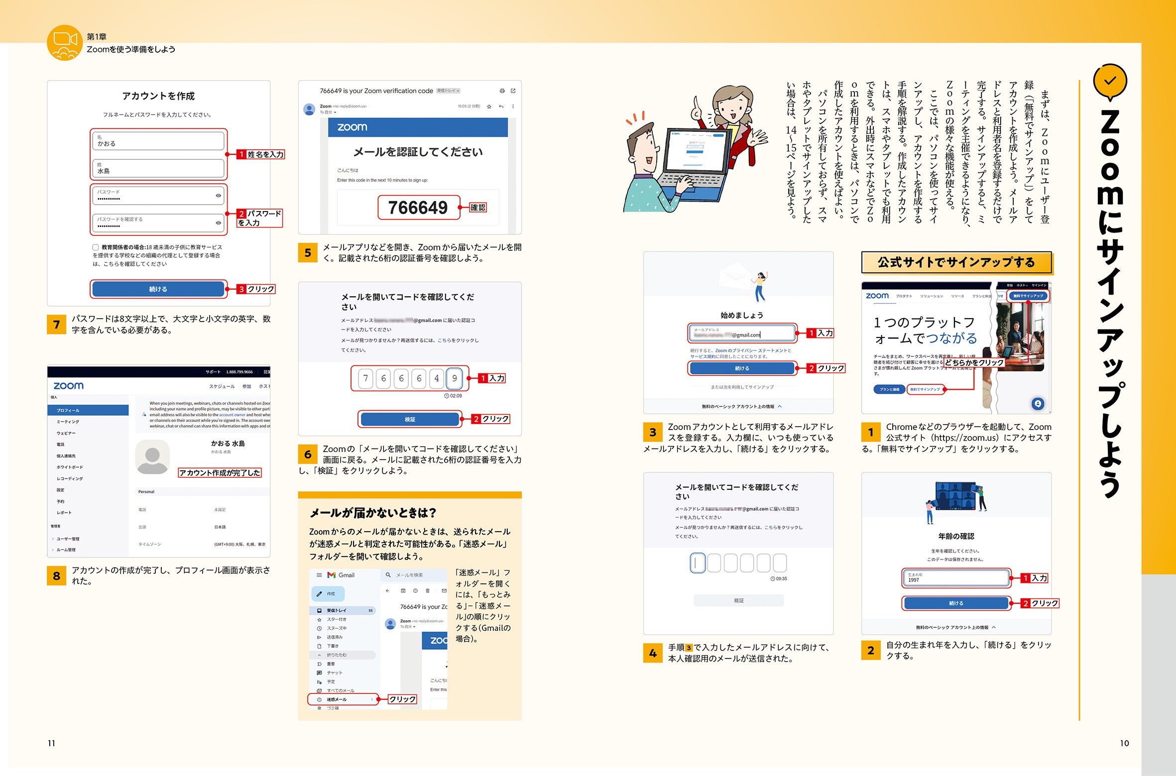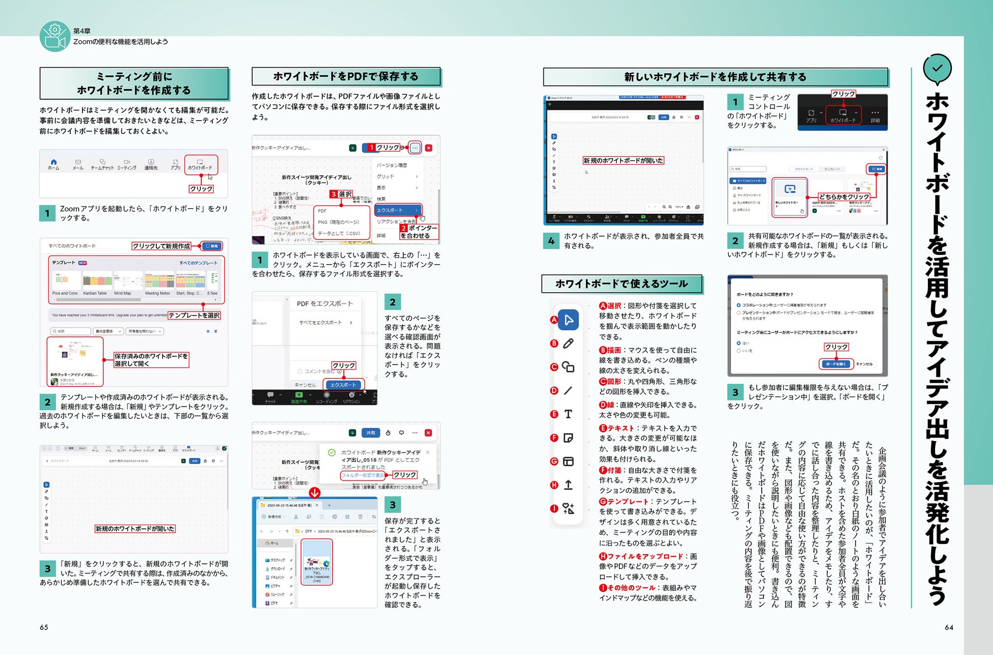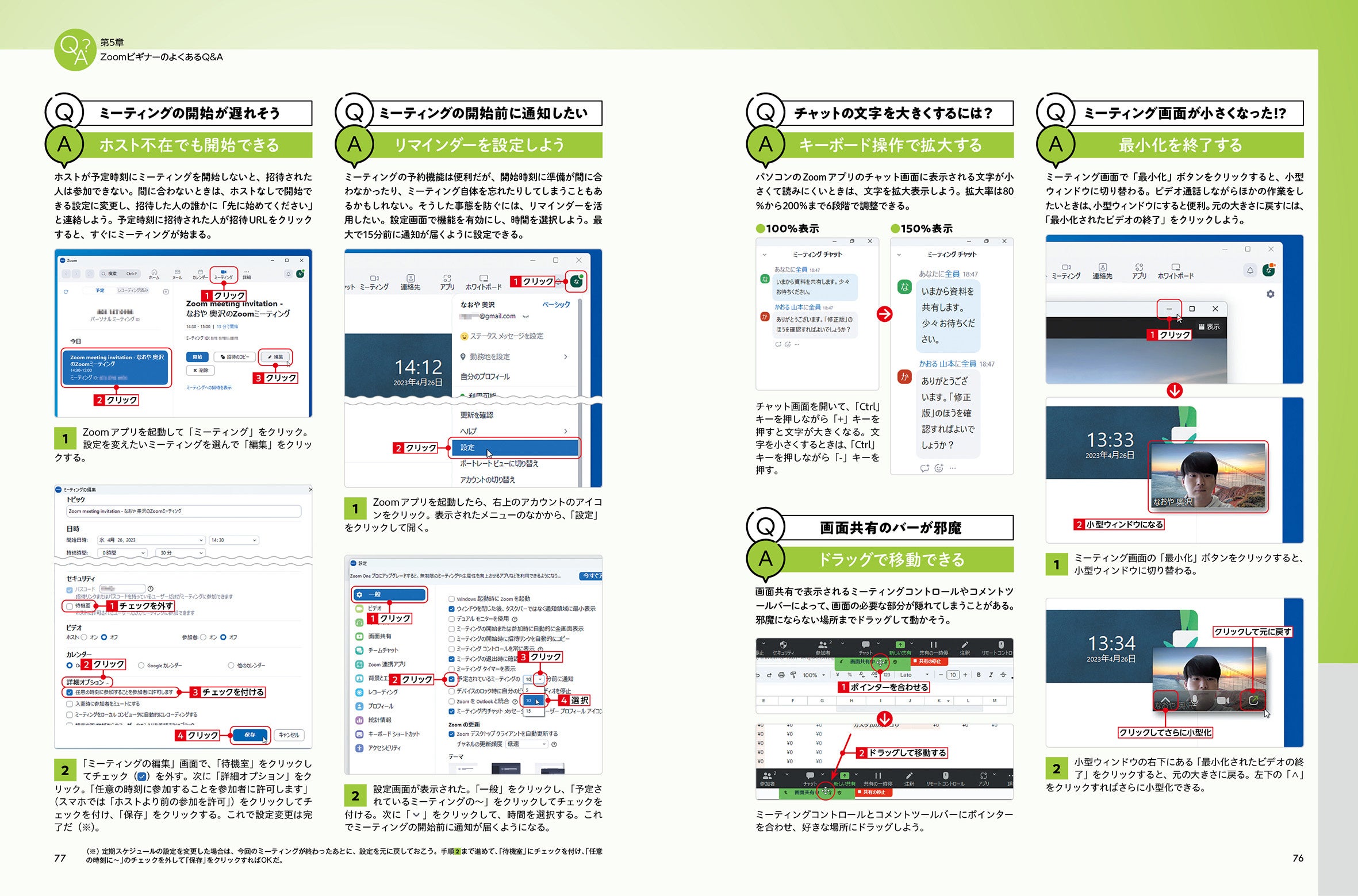 招待されたZoomの会議・会合に参加する方法も、自分でスケジュールを立てて会議・会合を開催する方法も、すべての手順を画像とともに紹介しており、はじめてでも迷わずに使いこなせます。